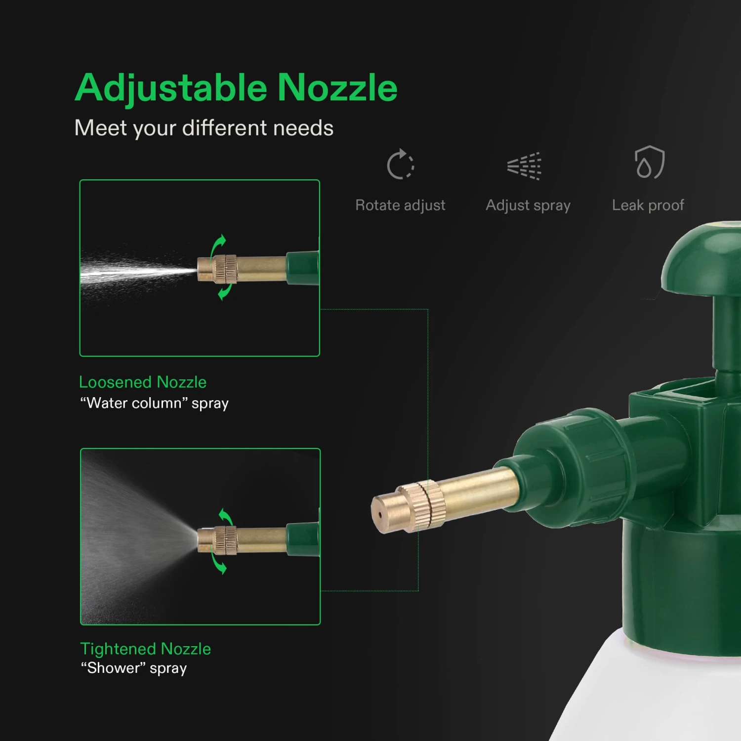 0.2 Gallon Handheld Garden Pump Sprayer (0.8L Green)Multi-functional: Compression sprayers for indoor and outdoor use. This sturdy sprayer is suitable for lawn and garden. Additional applications include car cleaning and maintenance. This product is suitable for spraying water up to 131°F.Translucent bottle: Unlike other invisible bottles, this VIVOSUN pump pressure sprayer contains a translucent bottle with a calibration scale. You can easily check the fluid level and know exactly when to refill.Humanized Design: Adjustable brass nozzle, ergonomic locking handle, and pressure release valve.Wide Usage: Use for plant, flower, garden and lawn care, auto wheels, windows, and exterior body.Warranty: We provide a 1-year warranty for this pump pressure sprayer. We promise to fix any problem and answer your questions as quickly as we can. We have an unmatched customer record, we are always available to assist our customers.