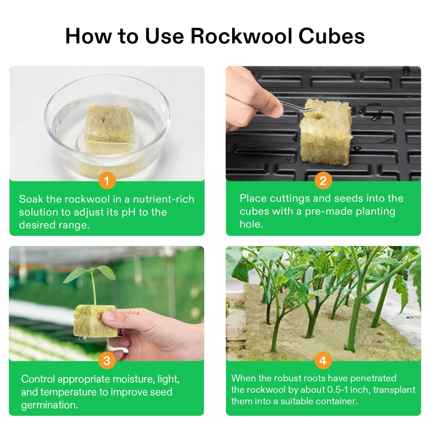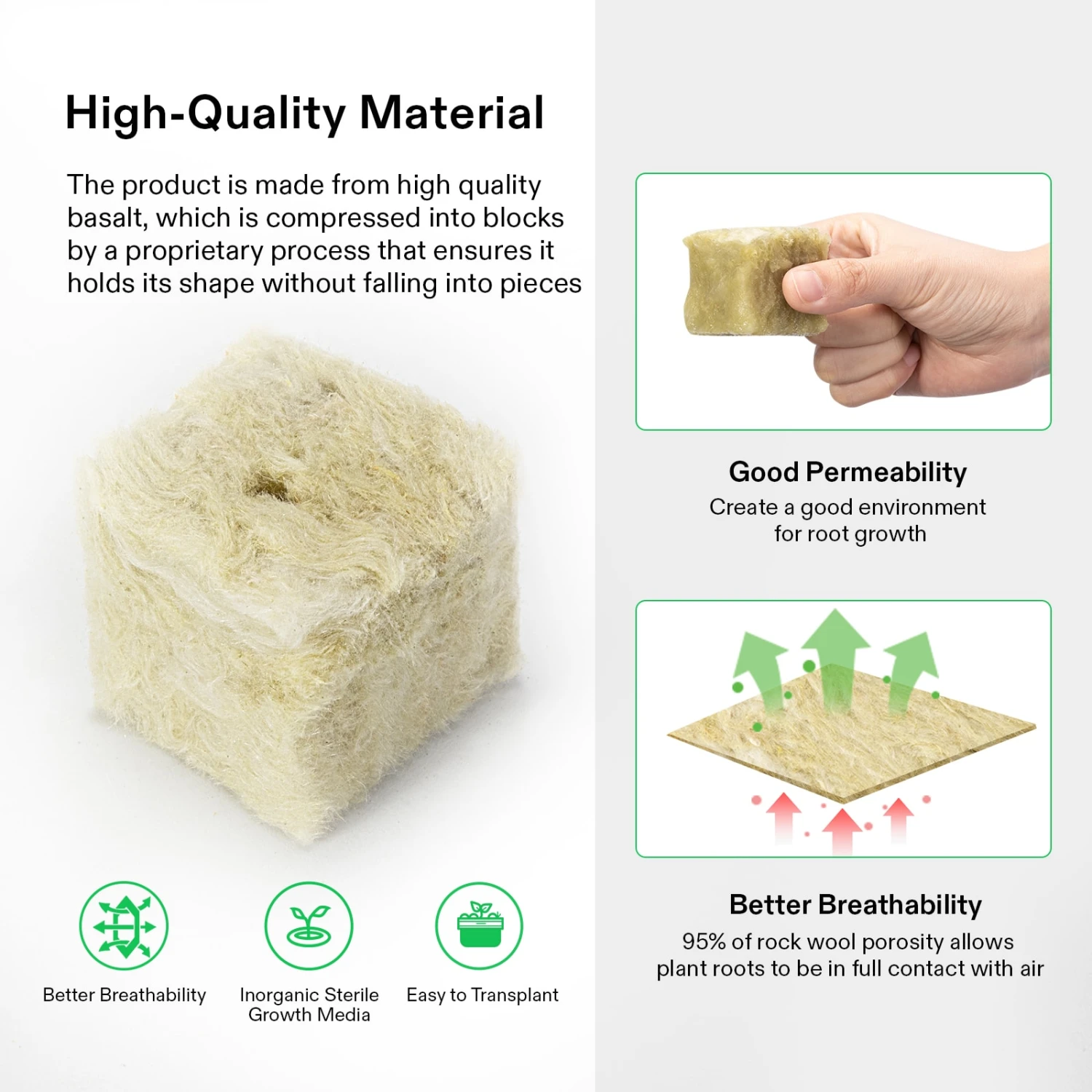 This 1.6″ Stonewool Grow Cubes Starter Sheets can be used for cuttings, cloning, plant propagation, seed starting, hydroponic grow media for vigorous plant growth.High-Quality Material: The product is made from high quality basalt, which melts at high temperatures to form fibers and is compressed into blocks by a proprietary process that ensures it holds its shape without falling into pieces.Good Permeability: 95% of rock wool porosity allows plant roots to be in full contact with air, retaining sufficient oxygen for rapid plant growth; Good water absorption and strong permeability create a good environment for root growth.Sterile & Water-Retaining: Inorganic and sterile growth media are more conducive to seed germination than soil; The fibrous structure retains water for longer, ensuring the water and nutrients needed for plant growth and facilitating the production of stronger root systems.Easy to Transplant: You can cut it into cubes of different sizes according to your needs; Each cube has a pre-formed hole into which you can easily place the seeds; Once the roots have developed, you can easily separate the cubes and transplant them into net pots, soil.Variety of Uses: Packed with a total of 28 cubes, each measuring 1.6×1.6×1.6 inches, these rockwool starter plugs are widely used for hydroponics, seed starting, plugging, plant propagation and more, making them an excellent choice for hobbyists and commercial growers.