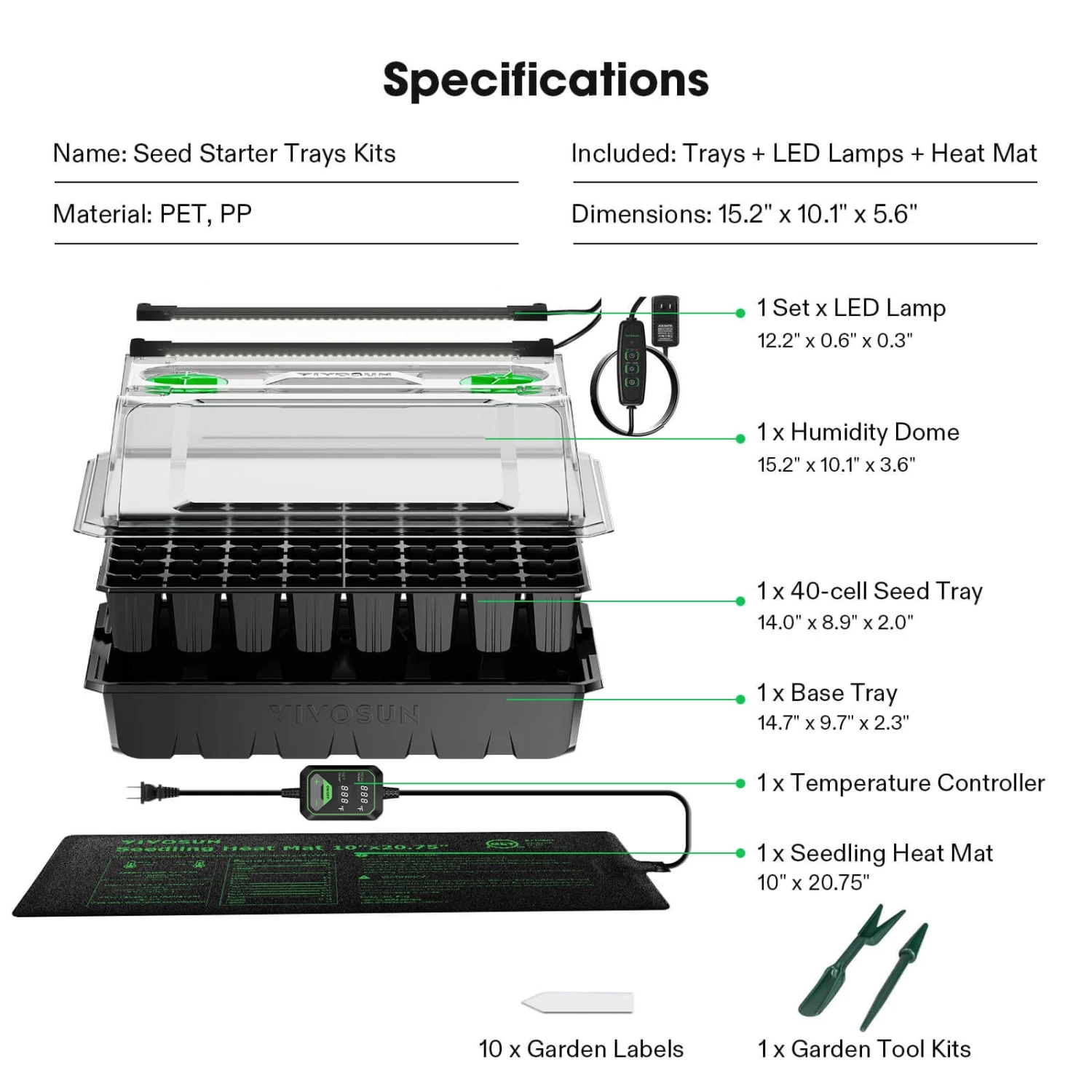 3.6″ Higher Cover, Adjustable Vents, Drainage Holes, Green Propagation Tray for Planting SeedsClear Dome, Adjustable Vents: Includes a transparent dome for easy observation without disruption of humidity levels; Two adjustable air vents help control humidity and temperature to keep your plants on the right track; Handle makes lifting the dome easy; Snap makes the user’s experience betterCrafted Details: LED light bars provide additional light to make the plants stronger as they grow; 240 cells mean more efficient seed-starting; Black bottom is good for promoting plant root growth and drainage holes keep your seedlings from being overwatered; 3.6″ Higher Cover leaves enough space for seedlings to grow strongerCompatible with Heat Mat: Our seed trays are made of durable, high-quality PET and PP material and are compatible with heating mat with a temperature range of 0 to 120°F; For best results pair the seedling tray with our heat matEasy to Use: Simply remove your plants from these seedling tray and transplant them into pots or your garden, it is a useful way to centralize your plant management; You can plant your seedlings in soil in the cells or use rockwool cubes depending on your needsDual Digital Display: This thermostat comes with a adjustment function allows users to set the desired temperature according to the needs of their plants—it’s simple and convenient to use; It also receives data from the internal sensor chip and displays the temperature of the heating pad in real-time