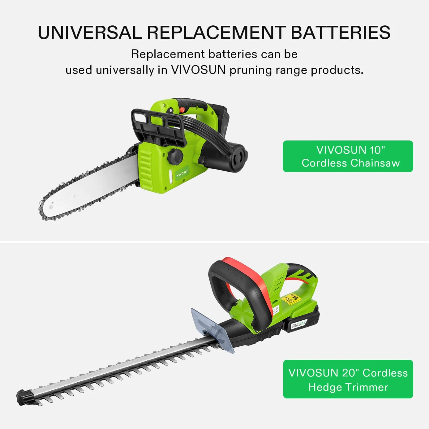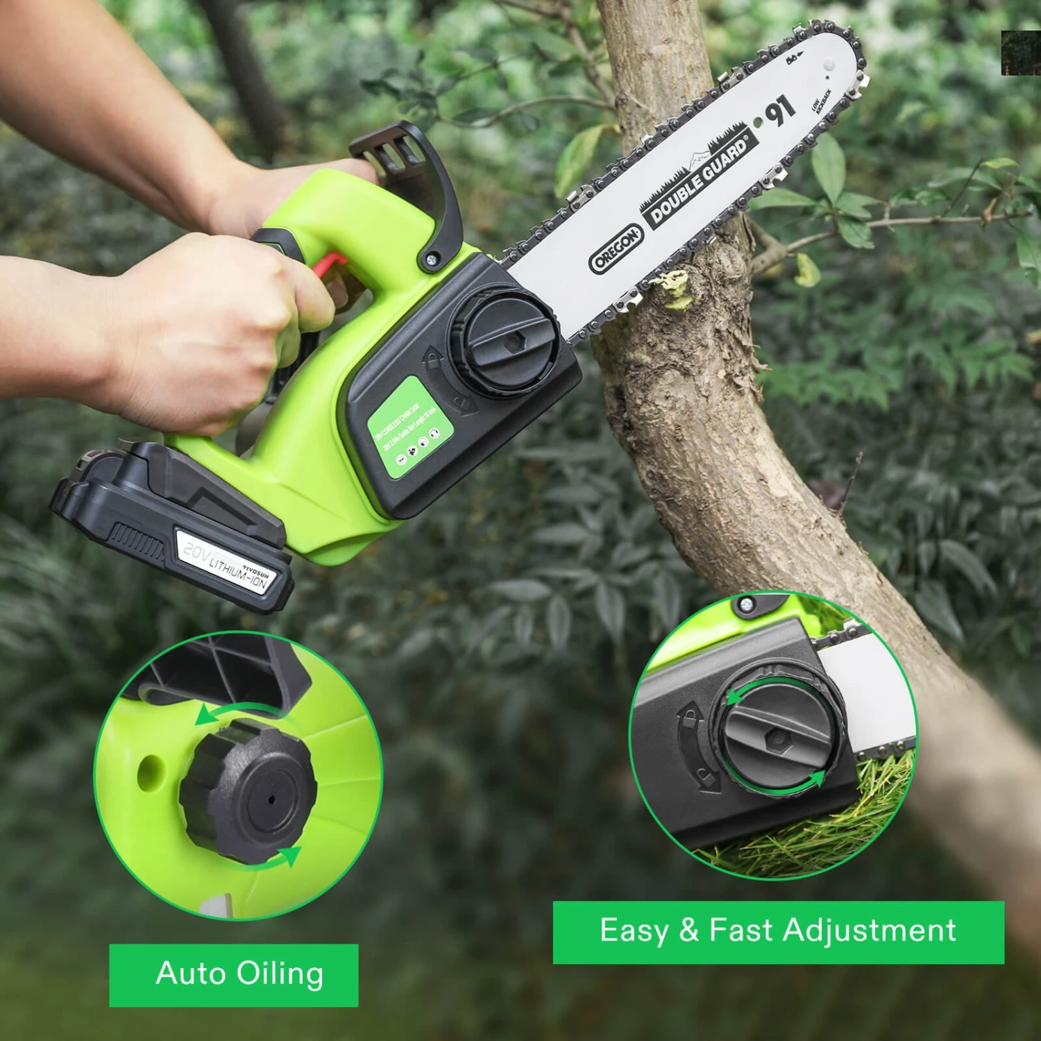 Equipped with 2 pcs batteries, security lock and automatic oiler, this lightweight mini chainsaw is user-friendly for women, powered electric chainsaw for trimming and helps you to keep your garden in order.Fast & Clean Cut: VIVOSUN 20V cordless chainsaw can be taken anywhere you need, free from the trouble of taking long, tangled cords; A 4-hour charging can provide 30 minutes of work persistently, and LED indicators on the batteries will inform you of the real-time battery power; Two batteries has a long lifespan, avoiding you to replace the battery in your using period.Auto-chain Lubrication: This chainsaw has an 75ml oil tank which can self-lubricate the chain, thus you only need to add not too much oil, and then it can keep your trimming smooth automatically and save electricity; Oil is not included.Safety Protection: This chainsaw has dual safety switches; To prevent accidental starting, the safety lock and trigger must be pressed simultaneously to start the saw; Besides, the handle of this product is wrapped with a soft rubber cover, which provides an anti-slip grip to make you work longer, with less strain.Compact, Lightweight and Efficient: This handheld cordless chainsaw weighs 7 pounds and measures 19.5 inches in length, making it so convenient that one hand can easily complete gardening logging in no time; Equipped with an ergonomic design that is friendly to women and non-professionals, the small size of the cordless chainsaw design allows us to do more portable work than traditional chainsaws can do.Product Specifications: This cordless chainsaw comes with low kick back 10 inch bar and chain speed up to 16.4ft./s; This product fits several using scenes like trimming, cutting, pruning, gardening, especially for household using.