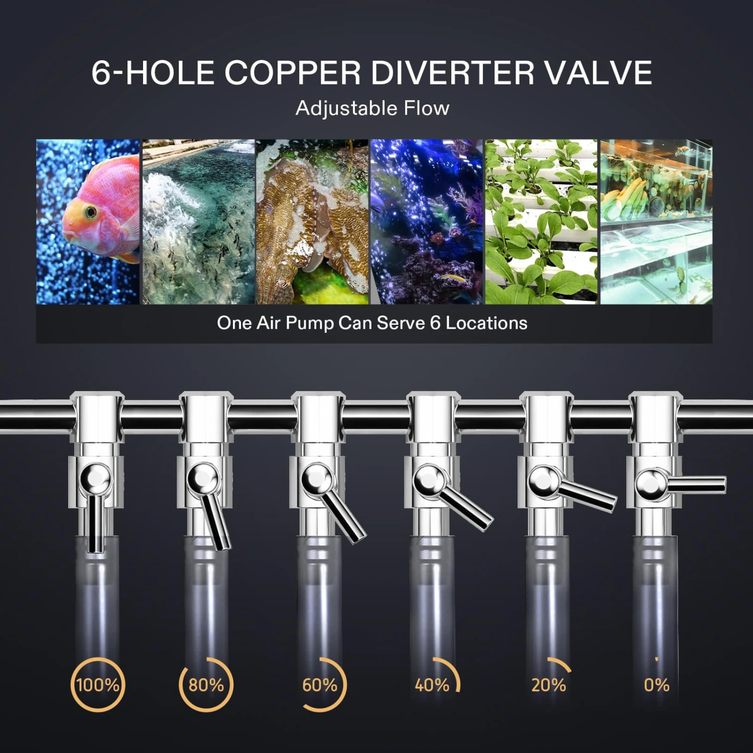 This air pump adds oxygen to your hydroponic growing system for healthy plant growth and nutrient uptake, dissipates heat more effectively and delivers excellent, long-lasting performance.Premium Materials & Great Heat Control: This pump dissipates heat more effectively with aluminum alloy heat-radiating plates, and delivers excellent, long-lasting performance with a high-quality aluminum manifold and 100% copper outlet nozzle.Maximum Air Pressure and Air Volume: VIVOSUN powerful 15W electromagnetic motor produces exceptional air pressure (over 0.02MPa) and sends a huge volume of air to the 6 adjustable valve outlets (compatible with 1/4″ air lines).Set It and Forget It: Innovative material engineering on the steel engine column and piston makes this pump perfectly energy-efficient and highly resistant to wear-and-tear, so you can leave it running 24/7; recommended for outdoor use.Quiet Solution for Hydroponics and Fish Tanks: This oil-free motor lubrication, low noise generation (under 60 decibels), and 1.5 m power cord make it the ideal pump for oxygenating an aquarium or plant roots in a hydroponics system.Great Performance: Pumping 20 liters of air per minute and rated for up to 1 year of service, this pump is the reliable solution you’ve been looking for.