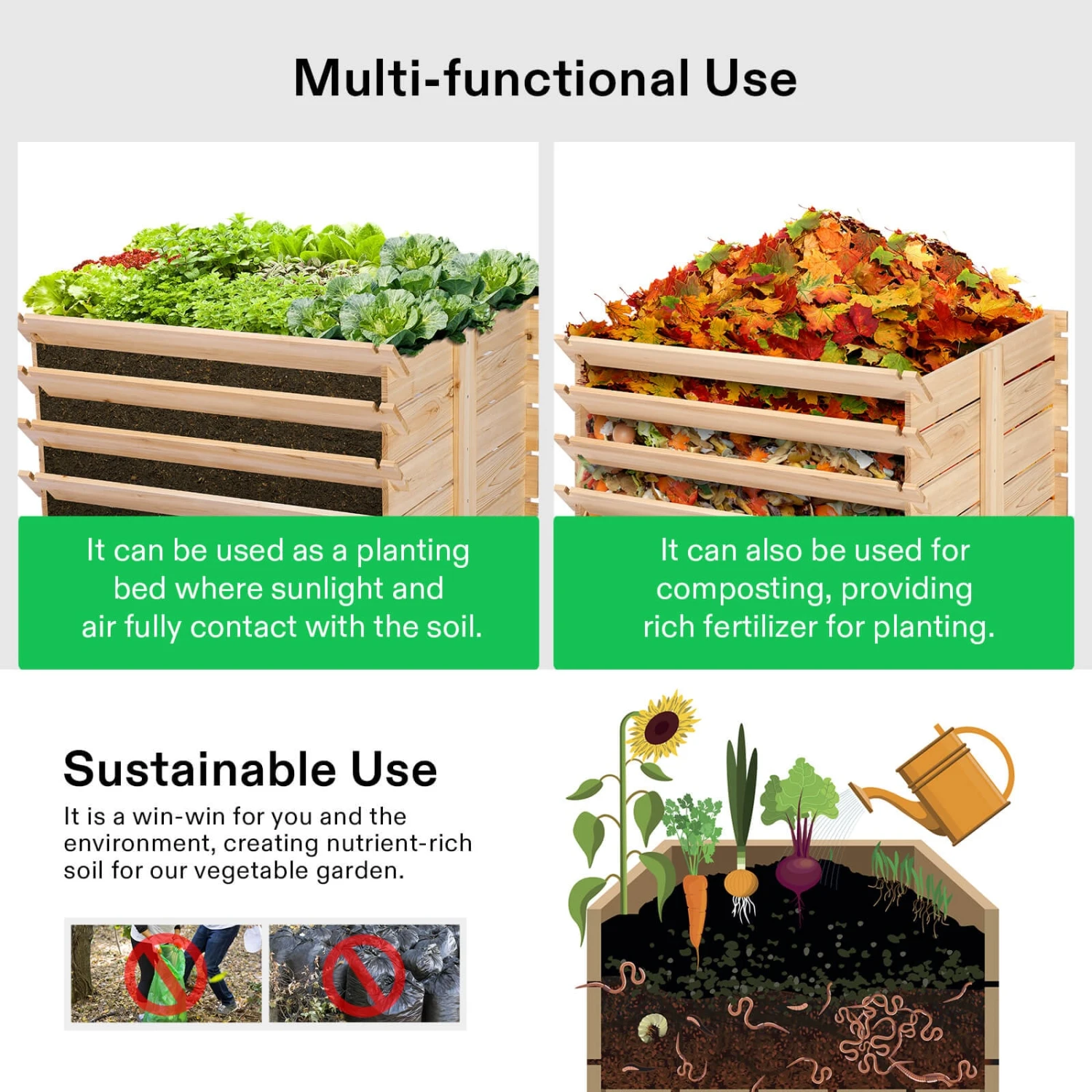 VIVOSUN 170 Gallon Wooden Compost Bin, Removable Front Door, Easy to Setup for Backyard, Lawn (Black with Gloves and Liner)Sturdy Fir Wood: The compost bin is built from durable fir wood that is weather-resistant; The sturdy structure prevents the compost bin from deforming and sagging over time, enabling it to last longer even when the weather is harshGood Ventilation System: Gaps between the boards of the composter helps air fully circulate, increasing the contact area and improving fermentation, thus speeding up the compositing of leaves, grass clippings, cardboard boxes, coffee grounds, kitchen waste, etc.Removable Front Door: The front door of the compost bin is designed with special slanted inserts, so when you need to go in to get the compost, you only need to pull out the appropriate number of boards according to your needsEasy to Assemble: The pre-sanded panels have dovetail joints that snap together and lock in place; No additional tools are required for a quick installation; Recommended to place on a flat surface and try not to move after selecting a locationBed Liner and Gloves Included: A pair of gloves and garden planter liner are included in the package; The liner can prevent the soil from making direct contact with the wood of the garden bed, thus keeping it in a good condition