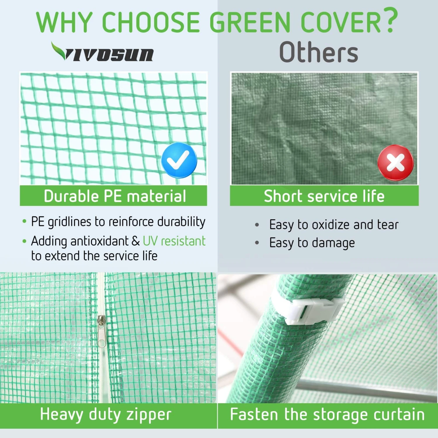 VIVOSUN 20x10x7 ft. Large Walk in Greenhouse Tunnel Garden Plant Hot HouseRoll-up Front Entrance and Window: Zipped roll-up entrances provide an easy access to the green house and a bigger operating space; 12 side windows bring a better air circulation to the green house, even if in hot weather, your lovely plants can breathe fresh airHeavy-duty Galvanized Steel Frame: Supported by galvanized finish heavy duty steel frame, our tunnel green house is more durable and anti-rust than those whose frames are powder-coatedReinforced PE Cover: The durable, waterproof and grid cover can protect your plants from rays and give them the optimal light conditions. Your plants will be nourished very well with our VIVOSUN strong walk-in green houseExtra Long Cover Design: Extra-long cover design provides a possibility to be buried in the soil, which reinforces the stability and airtight of our green house, bringing a better condition for the growth of tropical plantsDouble Stranded Edge Banding: Our green house is double-stranded edge banding, making the cover more tough and more durable; You can dispense with concerning about the bad weather because of our high-quality green houses