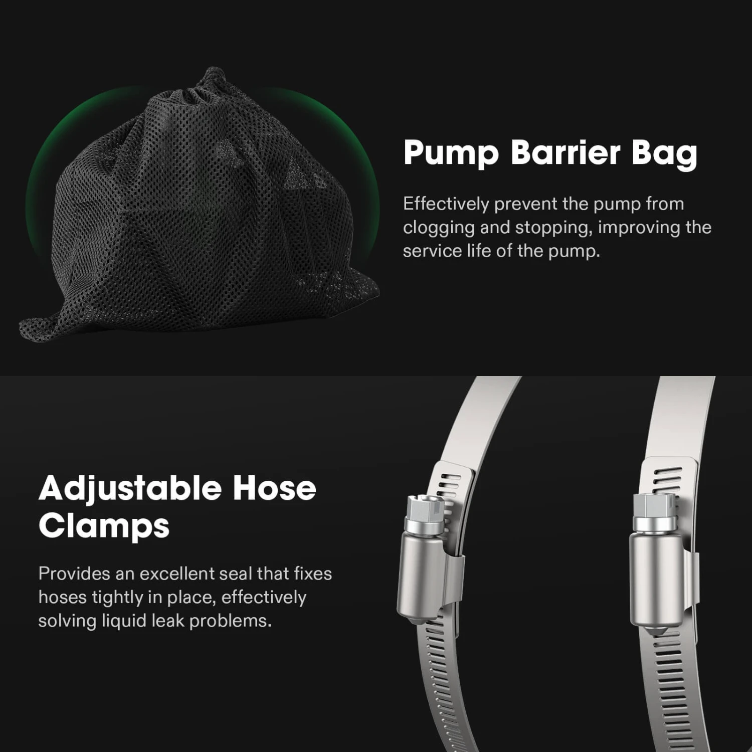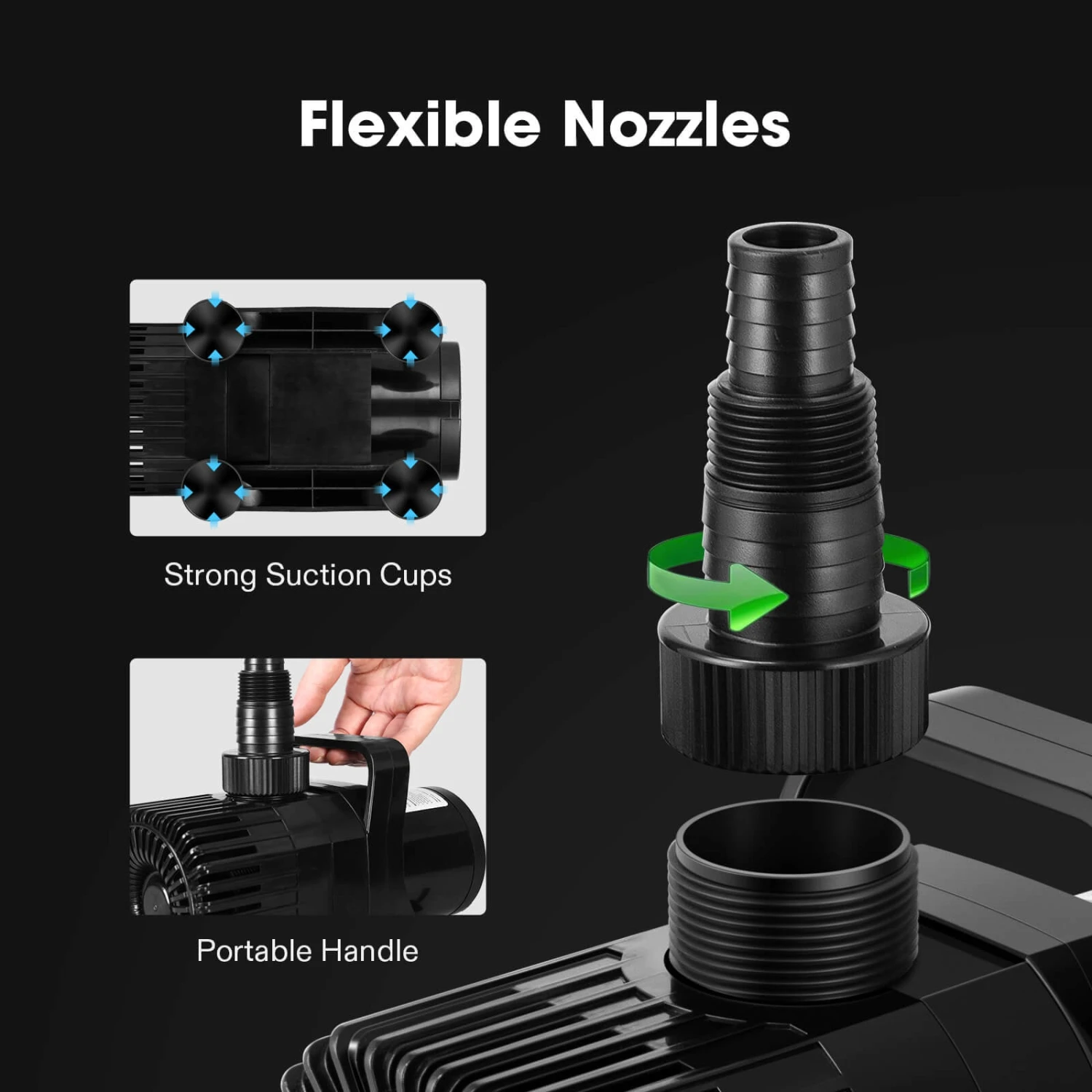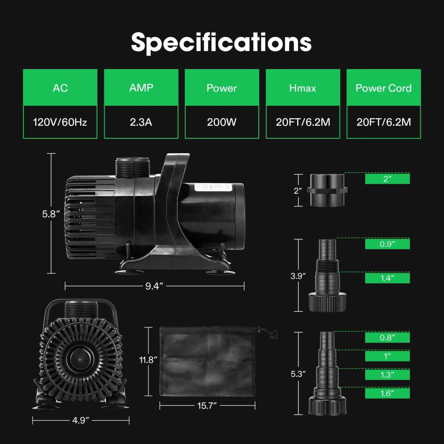 Ultra Quiet Pond Pump for Pond, Waterfall, Fish Tank, Statuary, Hydroponic, 20Ft. Lift HeightSolid Construction & Overload Protection: The shaft and drive ring piece are made from silicon carbide material, reduce the attrition and increase the service life; It is totally waterproof (IPX8) and provides overload protectionEnergy Saving with Low Noise: Ultra-quiet operation design (30-40db); Less power (200W) consumption with high output (2600GPH/9750LPH) which compared to other pumps; Fits for ponds, fish tanks, fountainsDetachable Filter & Barrier Bag: Lift height can be up to 20Ft/6.1M; Detachable filter and pump barrier bag effectively prevent the pump from clogging and stopping, improving the service life of the pumpCrafted Details: Adjustable outlet direction and 20FT power cord can meet different requirements; 3 spout adapters are suitable for a variety of sizes of water pipes for more convenient connection; Adjustable hose clamps Provides a good seal for you to hold the water pipe tightly in placeMultiple Usage: VIVOSUN Fixed Flow Rate pump can be used as submersible or inline; Multifunctional design for diving or land use; It is ideal for a variety of applications in ponds, fish tanks, fountains, waterfalls, etc.