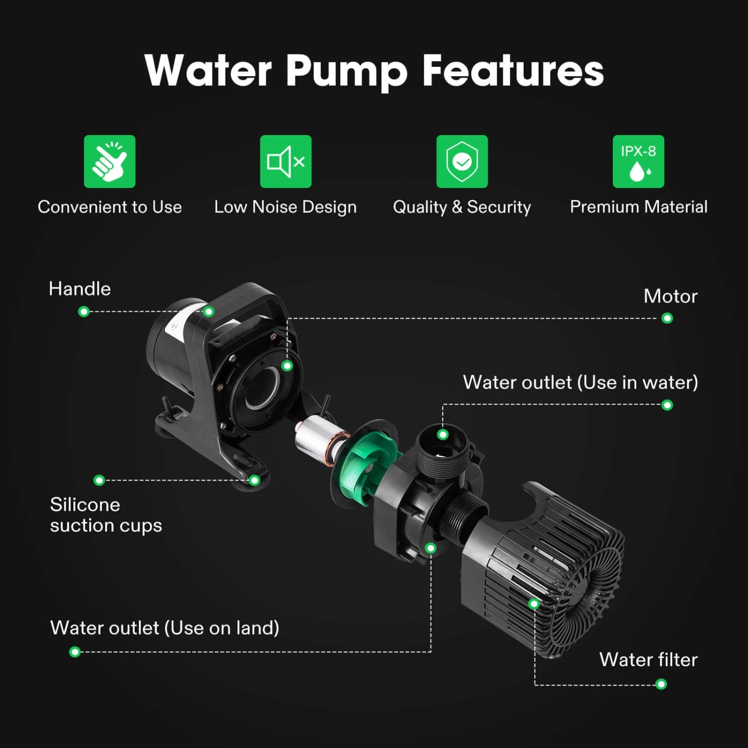 Ultra Quiet Pond Pump for Pond, Waterfall, Fish Tank, Statuary, Hydroponic, 21Ft. Lift HeightSolid Construction & Overload Protection: The shaft and drive ring piece are made from silicon carbide material, reduce the attrition and increase the service life; It is totally waterproof (IPX8) and provides overload protectionEnergy Saving with Low Noise: Ultra-quiet operation design (30-40db); Less power (300W) consumption with high output (3700GPH/13875LPH) which compared to other pumps; Fits for ponds, fish tanks, fountainsDetachable Filter & Barrier Bag: Lift height can be up to 21Ft/6.4M; Detachable filter and pump barrier bag effectively prevent the pump from clogging and stopping, improving the service life of the pumpCrafted Details: Adjustable outlet direction and 20FT power cord can meet different requirements; 3 spout adapters are suitable for a variety of sizes of water pipes for more convenient connection; Adjustable hose clamps Provides a good seal for you to hold the water pipe tightly in placeMultiple Usage: VIVOSUN Fixed Flow Rate pump can be used as submersible or inline; Multifunctional design for diving or land use; It is ideal for a variety of applications in ponds, fish tanks, fountains, waterfalls, etc.
