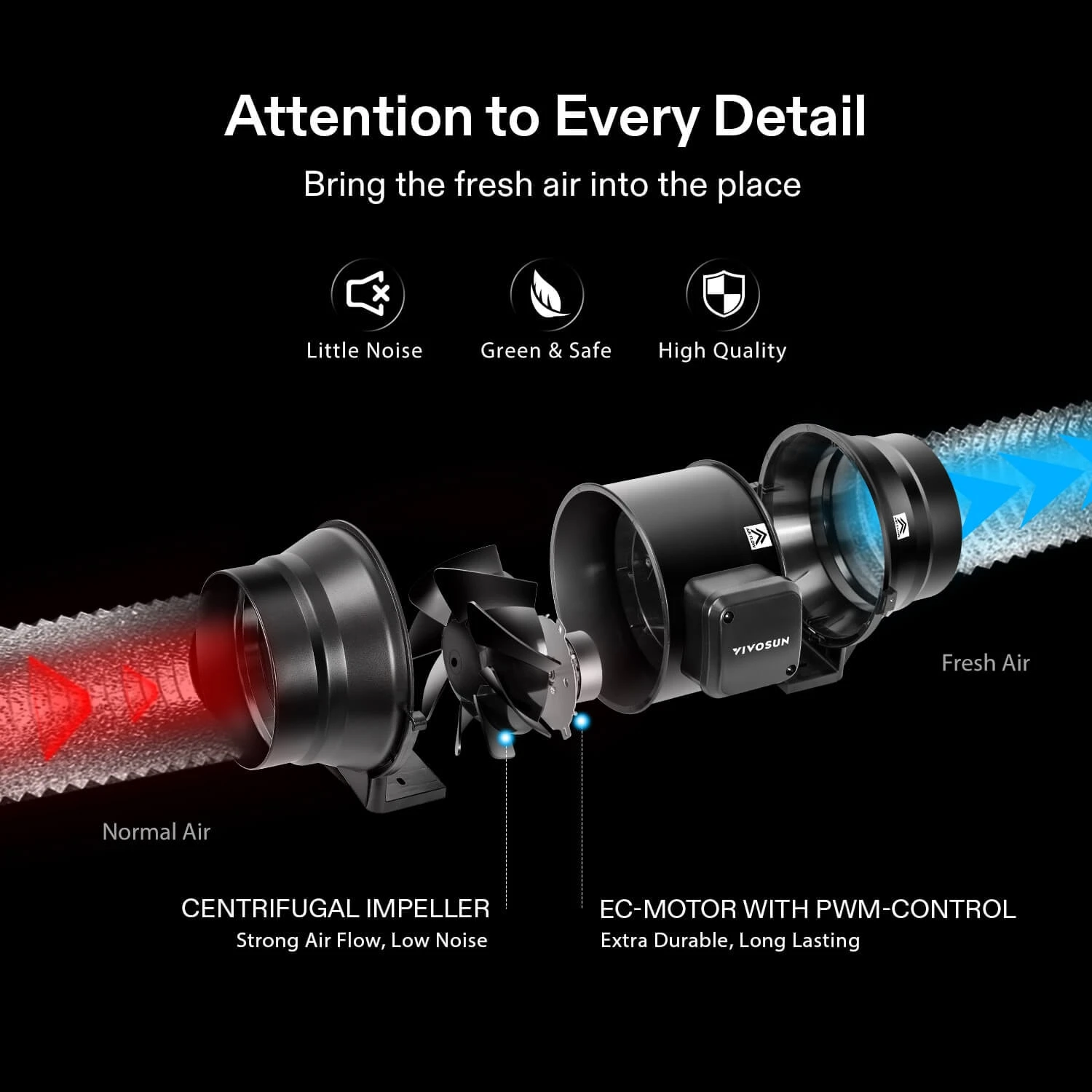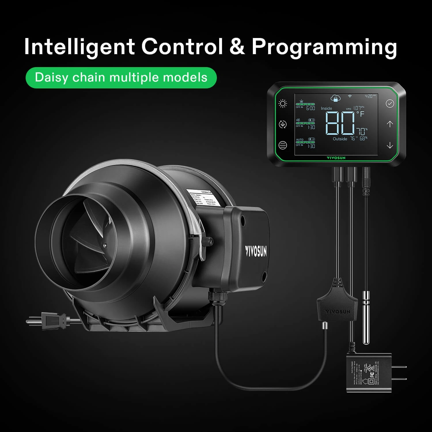 Quiet Ventilation Exhaust Fan and Temperature Humidity WiFi-Controller for Heating Cooling Booster, Grow Tents, HydroponicsUnify Your Equipment: You can operate them individually or unify all your smart devices through the GrowHub E42A platform to simplify the complexities of gardening to a scientifically manageable level and thus better stabilize your growth environmentEnergy-Saving & Quiet Operation: This Fan is controlled by PWM powerful and more energy-efficient; The mixed-flow design allows the fans deliver air across longer distances; The fan ventilates quietly at just 38 dBEasy Installation: Removable duct ends with locking tabs for quick removal and easy maintenance; The GrowHub E42A Controller features a magnetic & iron plate design, so it can be mounted on your tent fabric without an ugly mounting bracketFully Automated Environmental Control: Program your equipment to automatically take you through each stage of growth – program light intensity, light spectrum, on/off periods, fan speed, and airflow volume, make changes to better suit your plants at any timeApp Controllable: The GrowHub Controller is WiFi-enabled so you can control your equipment, and view the VPD and program settings from anywhere, anytime via the app; The App expands the controller’s capabilities through Grow Recipes and other extremely powerful settings