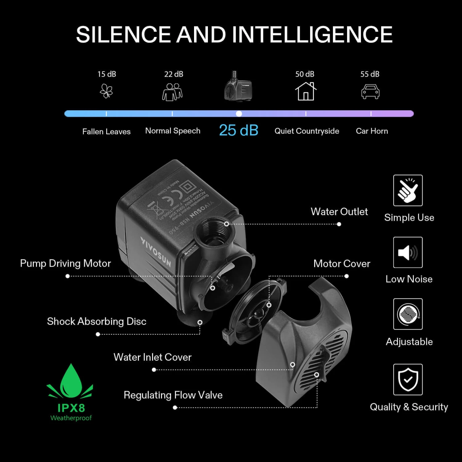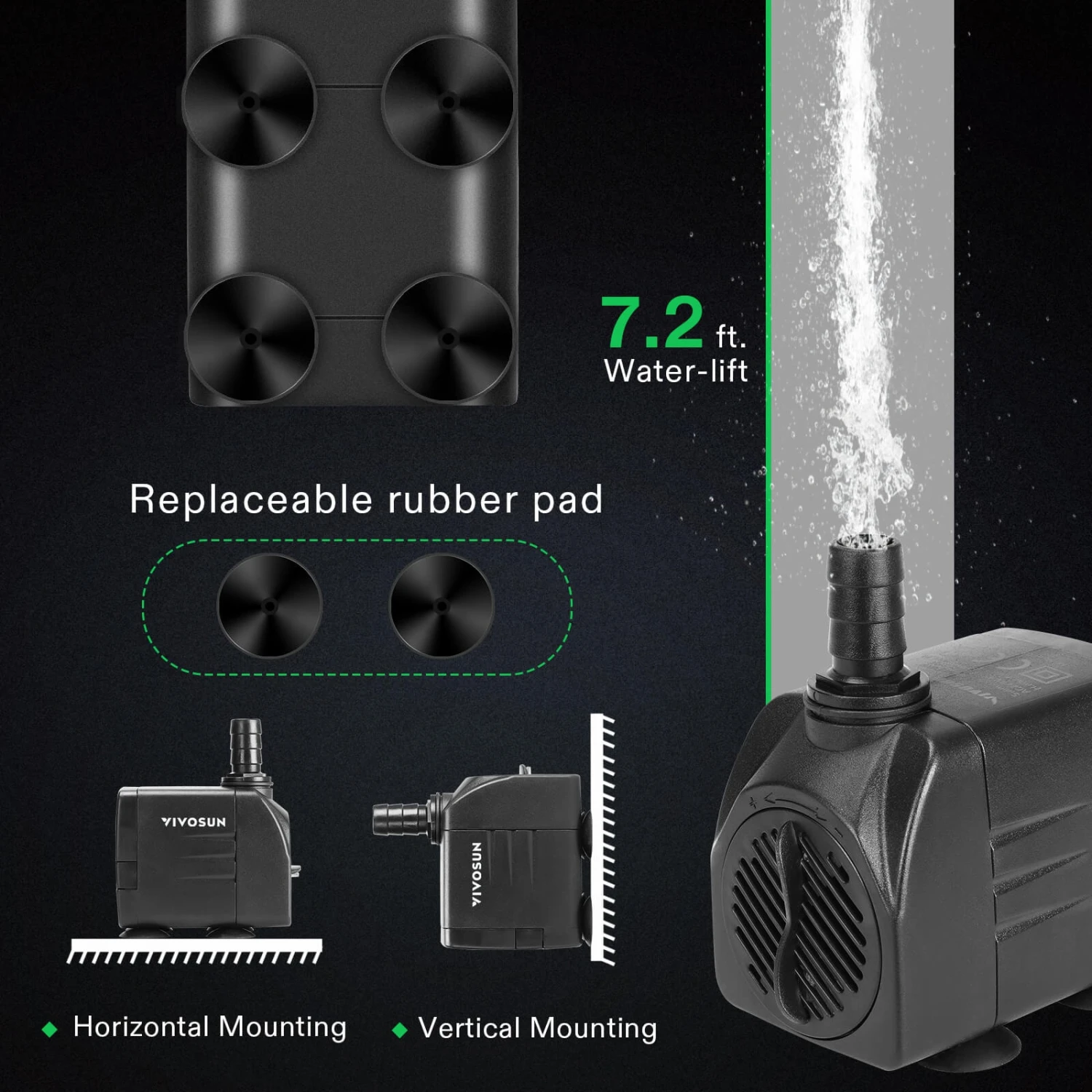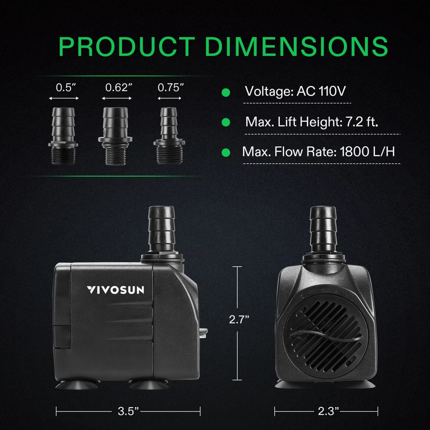 480GPH Submersible Pump, Ultra Quiet Water PumpSpecifications: Dimensions: 3.5*2.7*2.3inch; The 5ft long three-core power cord offers convenient installation; An Adjustable Knob to control the water flow rate, so you can get just the amount of water pressure you want; Max Flow Rate: 480 GPH (1800L/H), Max Lift height: up to 7.2Feet. Watt: 25W; Voltage: AC110V.Detachable & Cleanable: This profile size water pump is easy to hide or disguise; The device doesn’t need any tools to disassemble it and is very easy to be cleanedOptional Outlet Positions: Place the pump flat on its base, and you can get many positions. Manually rotate into the desired positionWide Application: High-Performance Energy-efficient Pumps designed for use in Ponds, Fountains, Waterfalls, Hydroponic Systems, Irrigation Systems, and water featuresWarranty: Super durable & reusable; Comes with a 12-month warranty; Any problems with the item you received, please contact us without hesitation