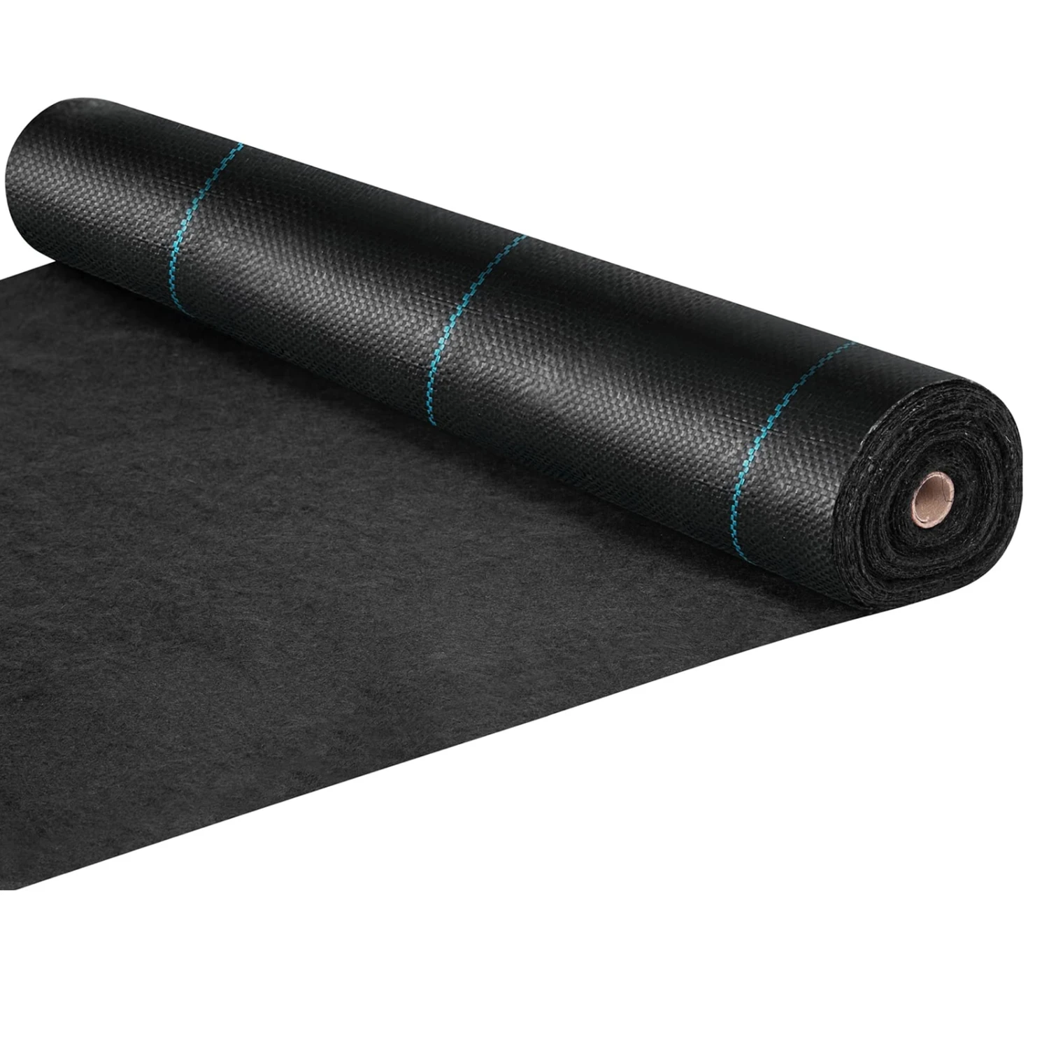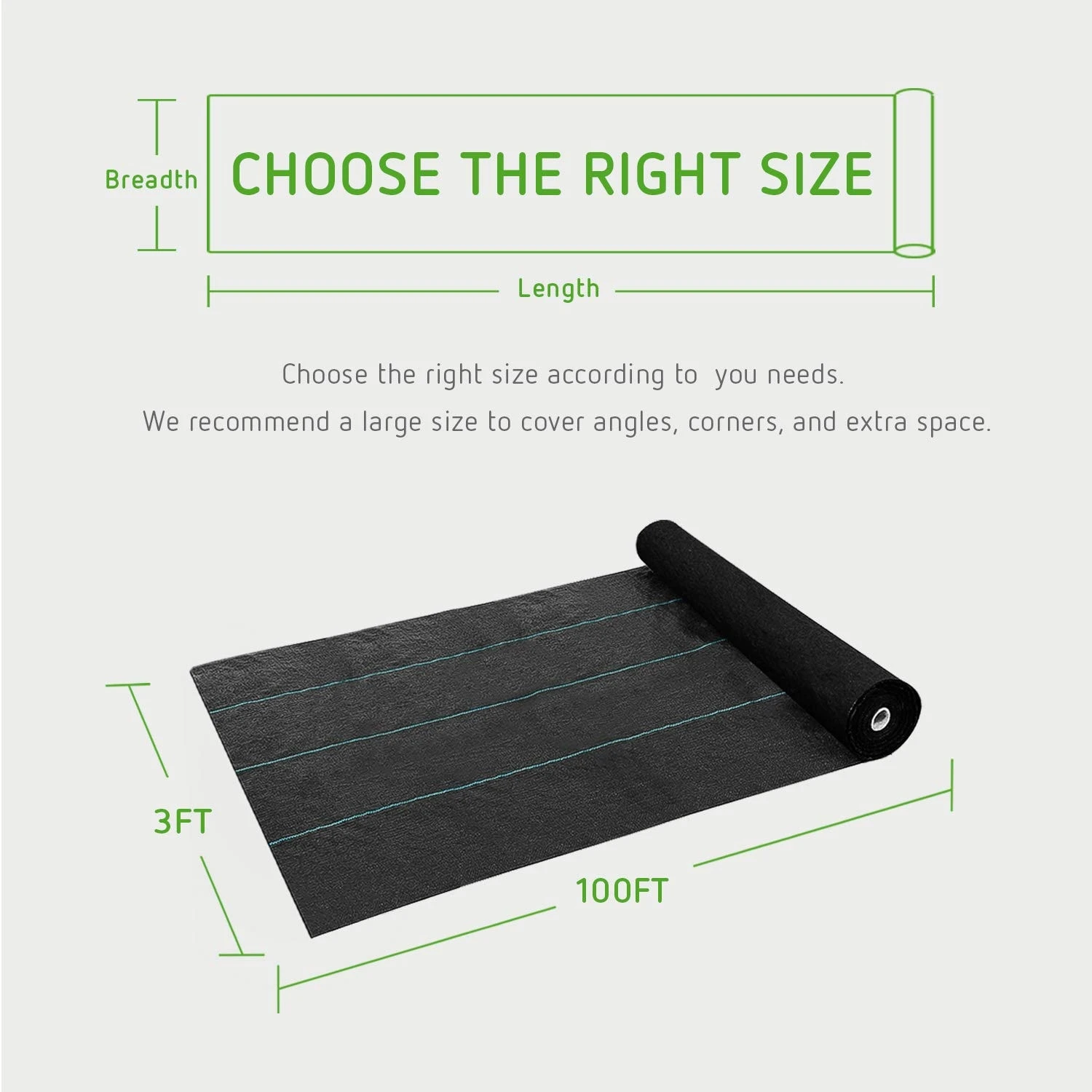 VIVOSUN 5oz/sy Barrier Landscape Fabric 3 ft. x 100 ft, Commercial Ground Cover Fabric Block, Gardening Fabric Mat, Black Heavy Duty Garden Cloth Felt for Flower Bed, Patio, Orchard, and PlaygroundPremium Quality and Durability: The VIVOSUN 2-layer barrier landscape fabric is thick, durable, and composed of a high-density, 5 ounces per square yard woven fabric base with a fuzzy non-woven needle-punched fabric; It can last more than 5 years when exposed to direct sunlight and more than 25 years if not in direct sunlightGood Drainage: The water permeability of our garden fabric mat is 4 times more than that of other traditional woven ground covers; Air and water flow through more easily, allowing roots to respire sufficiently and groundwater to drain rapidlyMultifunctional: This commercial grade garden felt can be used for landscape or soil stabilization purposes or as a barrier in your garden, flower beds, walkways, driveways, patios, backyards, playgrounds, orchards, vegetable patches, grasses, gabions, and other placesEasy to Set Up: Our heavy-duty garden fabric mat is 3 ft. in width by 100 ft. in length, and you can cut it to whatever size you need; When you’re done adjusting the size, just lay the fabric down on the ground; The cut edges fray less and unravel less because of its special constructionThoughtful Design with Green Line Guides: Green line guides are incorporated into the roll and appear every foot as a guide to help align plants; The sturdy structure of this fabric blocks or prevents unwanted plants from passing through