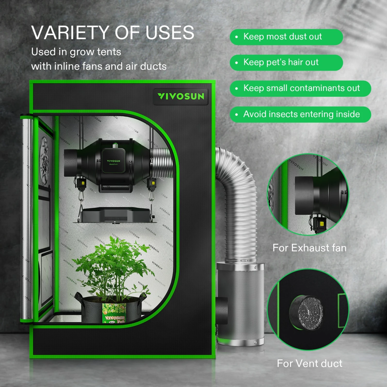 The VIVOSUN vent filter dust cover is specifically designed to keep dust and small contaminants out with a fine mesh while still delivering superior ventilation.Fine Mesh: The mesh and grid spacing of this tent vent cover are small enough to keep most dust and small contaminants out without affecting ventilation or entering the inside environment, providing protection for plants and keeping them healthy.Elastic Latch Design: The 6” tent vent cover has an elastic drawstring and fixed latch so that you can conveniently adjust the size of the opening to suit your needs and secure it more firmly to the vent without risk of it falling off.Durable Material: The duct filter cover is made of water-resistant and reusable Oxford fabric; The elastic cord and locking clips are made of rubber and the middle net is made of high-quality, high-durability plastic.Easy to Use and Clean: Simply place the filter dust cover over the vent opening and secure it with the drawstring and latch; This 4” product comes in a two-pack, so it is easy to replace and is hand and machine washable.Variety of Uses: This tent vent cover can be used in grow tents with inline fans and air ducts; It also avoids shrinkage of the tent fabric caused by the difference in air pressure between the inside and outside of the tent.