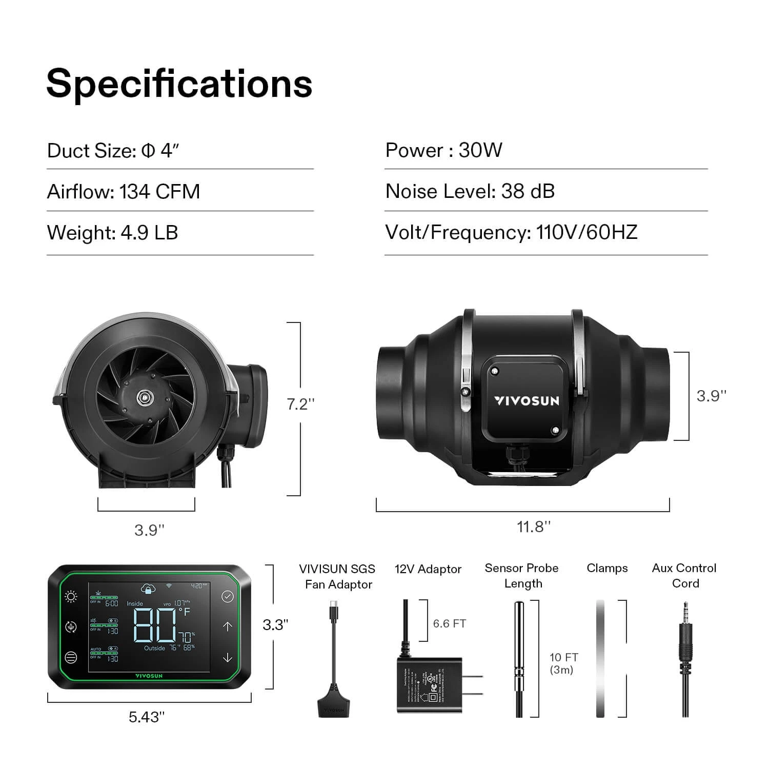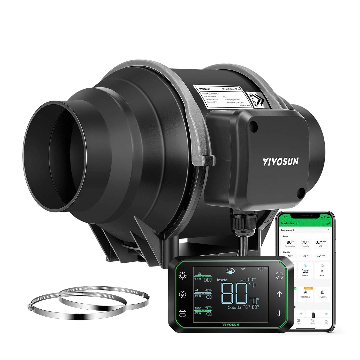 Quiet Ventilation Exhaust Fan and Temperature Humidity WiFi-Controller for Heating Cooling Booster, Grow Tents, HydroponicsUnify Your Equipment: You can operate them individually or unify all your smart devices through the GrowHub E42A platform to simplify the complexities of gardening to a scientifically manageable level and thus better stabilize your growth environmentEnergy-Saving & Quiet Operation: This Fan is controlled by PWM powerful and more energy-efficient; The mixed-flow design allows the fans deliver air across longer distances; The fan ventilates quietly at just 42 dBEasy Installation: Removable duct ends with locking tabs for quick removal and easy maintenance; The GrowHub E42A Controller features a magnetic & iron plate design, so it can be mounted on your tent fabric without an ugly mounting bracketFully Automated Environmental Control: Program your equipment to automatically take you through each stage of growth – program light intensity, light spectrum, on/off periods, fan speed, and airflow volume, make changes to better suit your plants at any timeApp Controllable: The GrowHub Controller is WiFi-enabled so you can control your equipment, and view the VPD and program settings from anywhere, anytime via the app; The App expands the controller’s capabilities through Grow Recipes and other extremely powerful settings