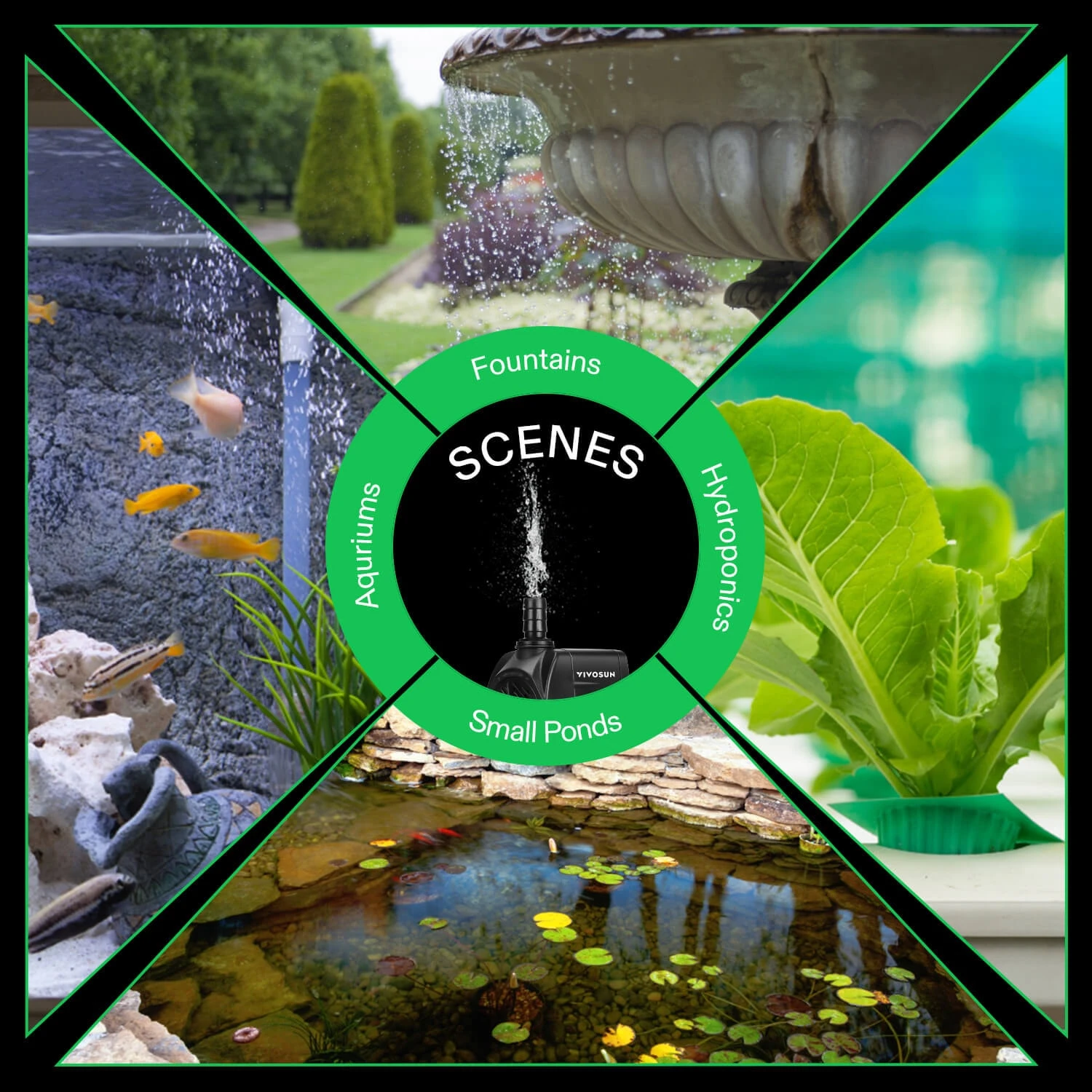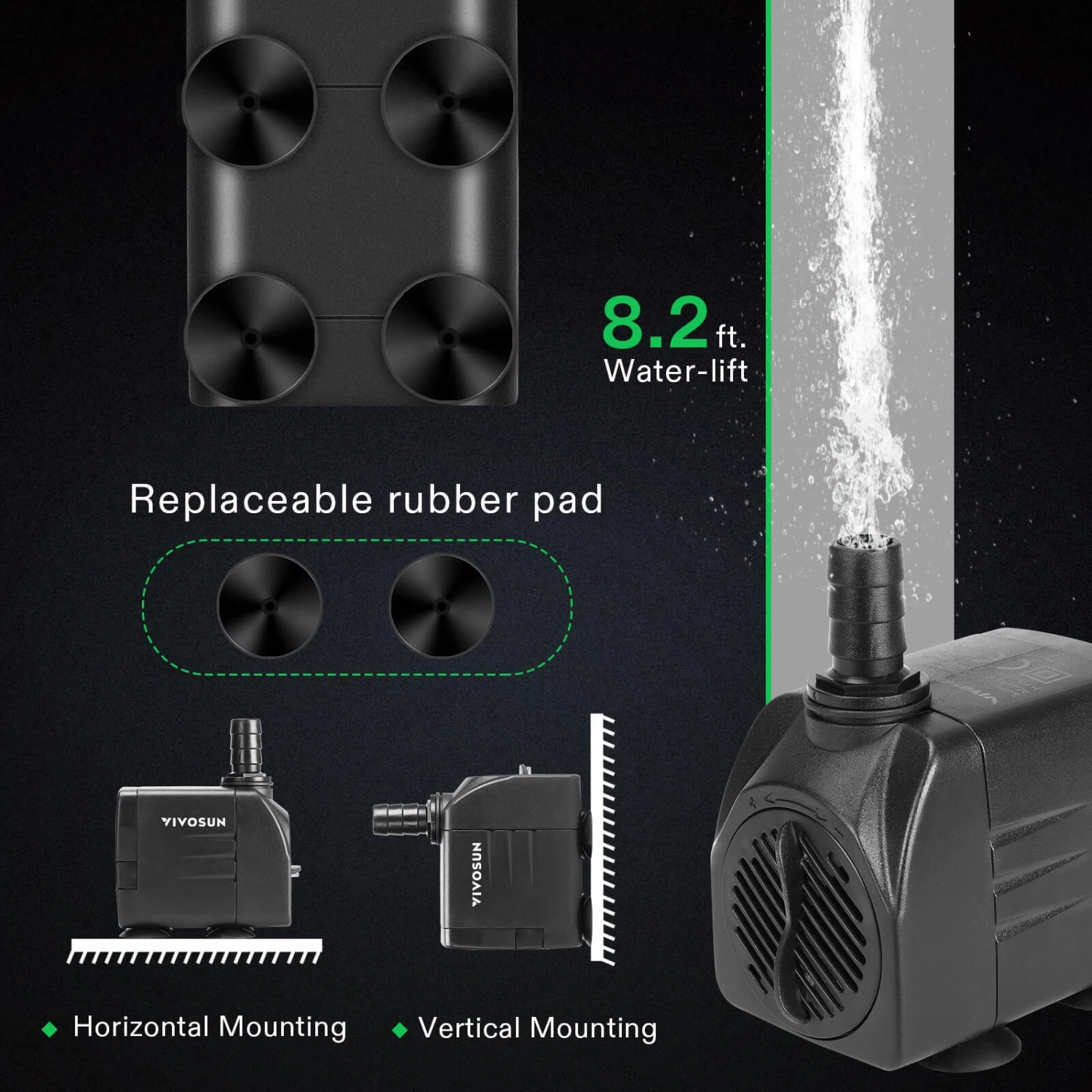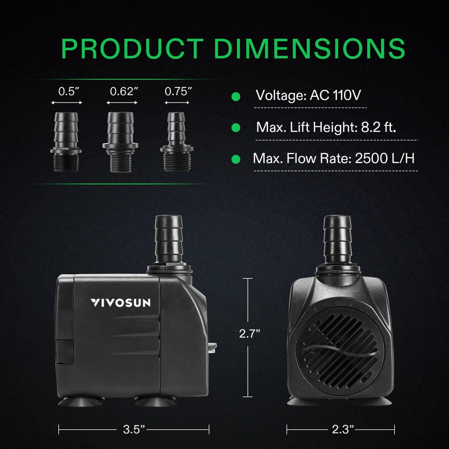 VIVOSUN 660GPH Submersible Water Pump, 2500L/H 35W aquarium pump, Ultra Quiet Fountain Pump with 8.2ft/2.5m High Lift for Fish Tank, Pond, Aquarium, Statuary, HydroponicsKey Parameters: SizeAdjustable Flow Rate: This mini water pump features an adjustable knob that controls the water flow rate; Max. flow rate can reach up to 2500L/H; 3 optional nozzles (13/16/19 mm) allow you to create different view scenes, each with its own unique design; The water column can be elevated up to 3.0 ftUltra-Quiet Operation & 4x Suction Cups: Ultra-quiet operation will let you immerse in a comfortable & tranquil atmosphere; Just enjoy the peace and watch your cute fish swimming inside their tank; 4x solid rubber suction cups at the bottom ensures a strong gripDetachable & Cleanable: This powerful & compact fish tank water pump is easy to hide and disguise; No need for any tools to detach it, simple to separate, and easy to cleanMulti Uses: A well-designed aquarium water pump is beneficial to use for small to medium sized aquariums, ponds, fountains, waterfalls, hydroponic systems, etc