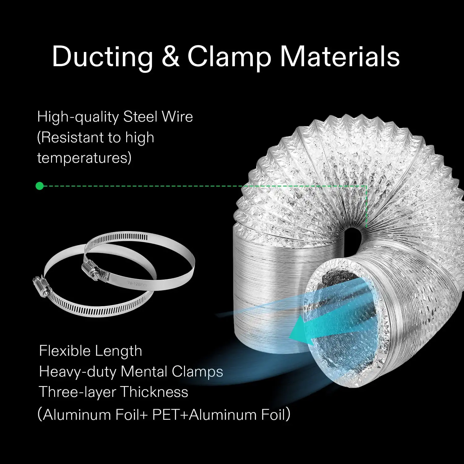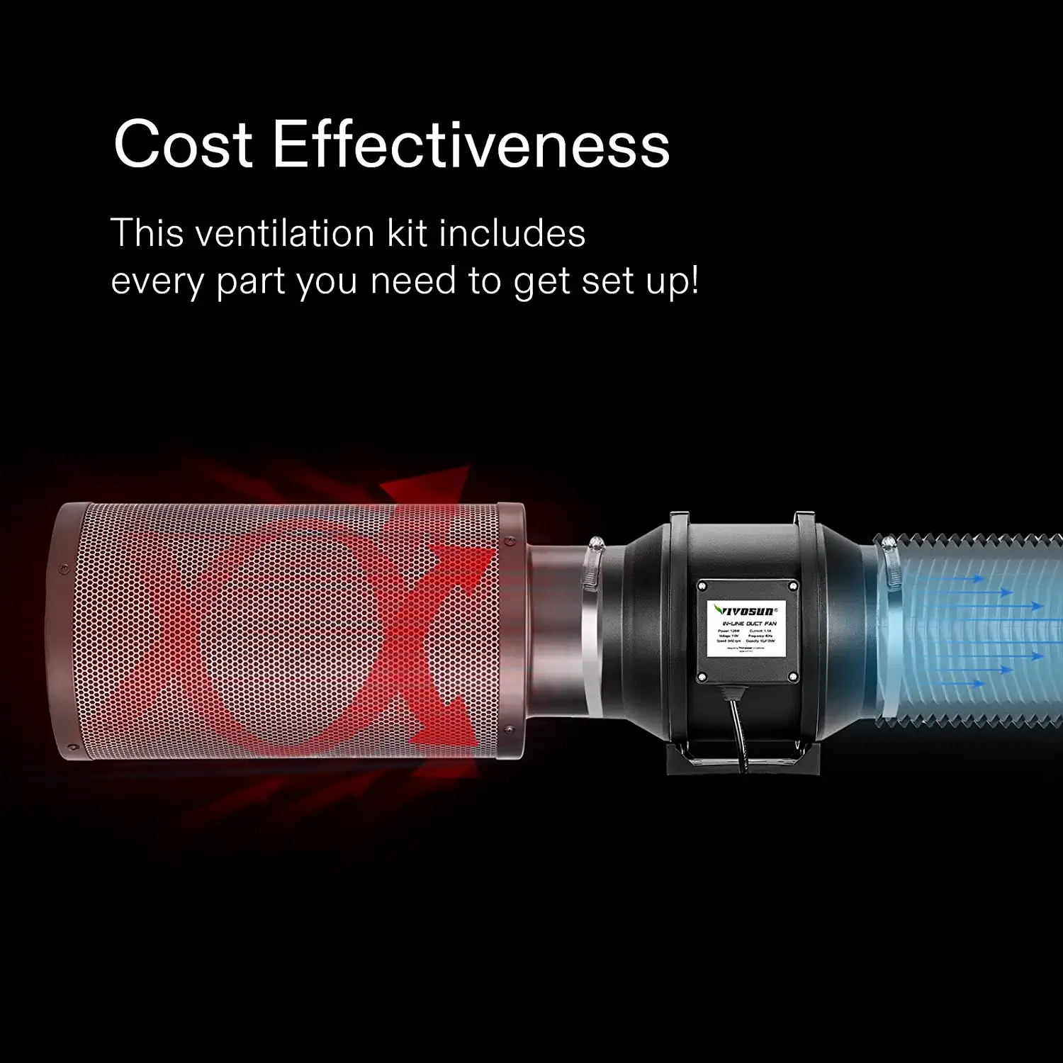 VIVOSUN Air Filtration Kit, 8” 720 CFM Inline Ventilation Fan with Speed Controller, 8” Black Carbon Filter and 25’ of Ducting for Grow Tent, Planting room, Air CirculationPerfect Combination: Three-part system includes every part you need to get set up; It is primarily used in various air circulation and ventilation projects to move and transport airEnergy-Efficient Ventilation: The inline duct fan helps solve ventilation problems; This fan is durable and runs smoothly and quietly; Variable speed controller facilitates fan speed adjustmentExcellent Odor Control: The porous activated carbon with 1050+ RC 48 Australia Virgin Charcoal helps eliminate some of the most undesirable, pungent smells and particulates for indoor grow tentsPerfect Connector: The VIVOSUN ducts are made of high-quality aluminum; Features a double layer of protection with PET thermoplastic; Comes with two heavy-duty stainless clampsCost Effectiveness: This combination is not only suitable for green house air circulation, but also for bathroom ventilation, stove exhaust, kitchen cooking exhaust, etc.