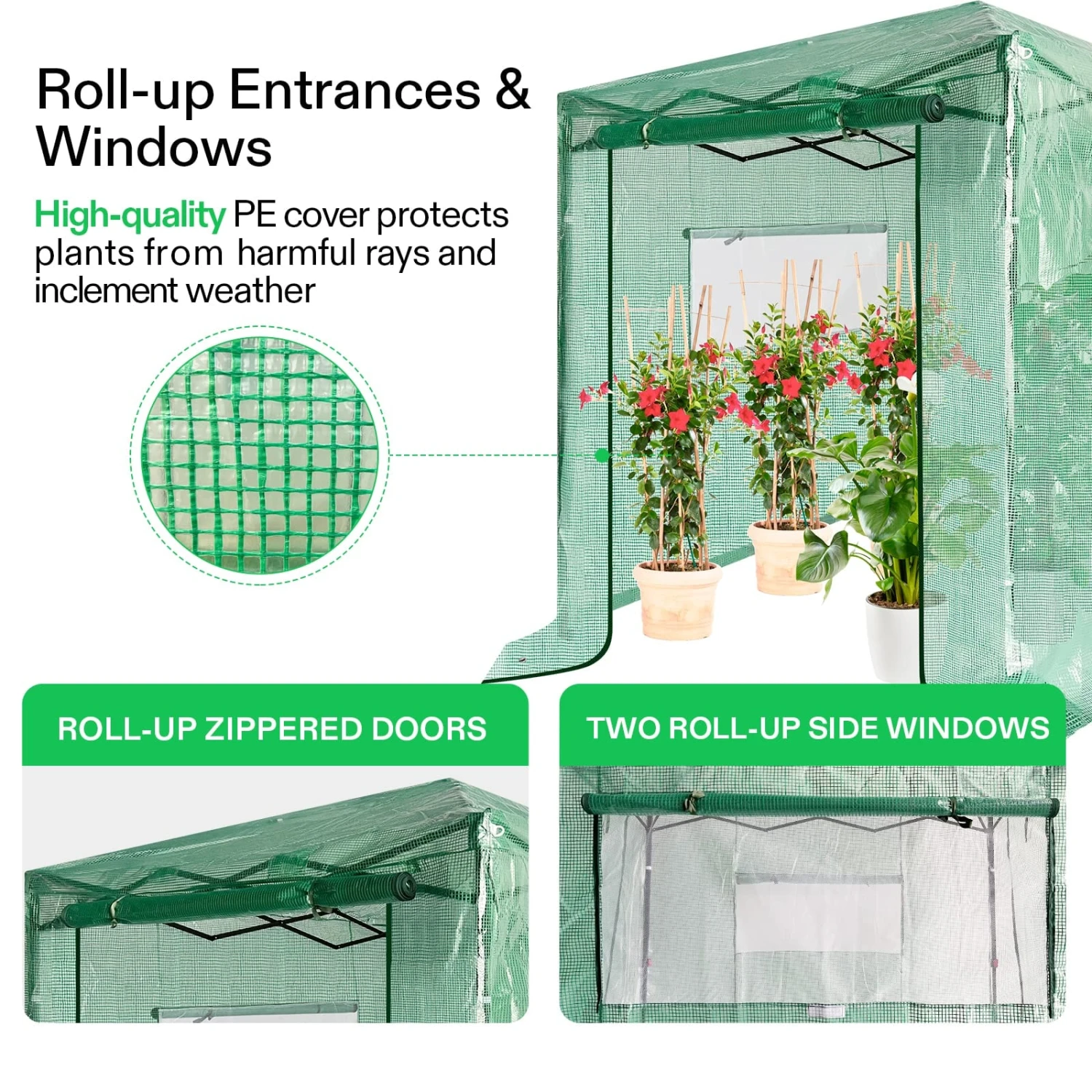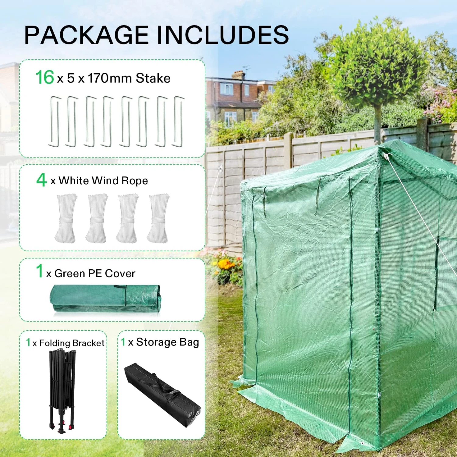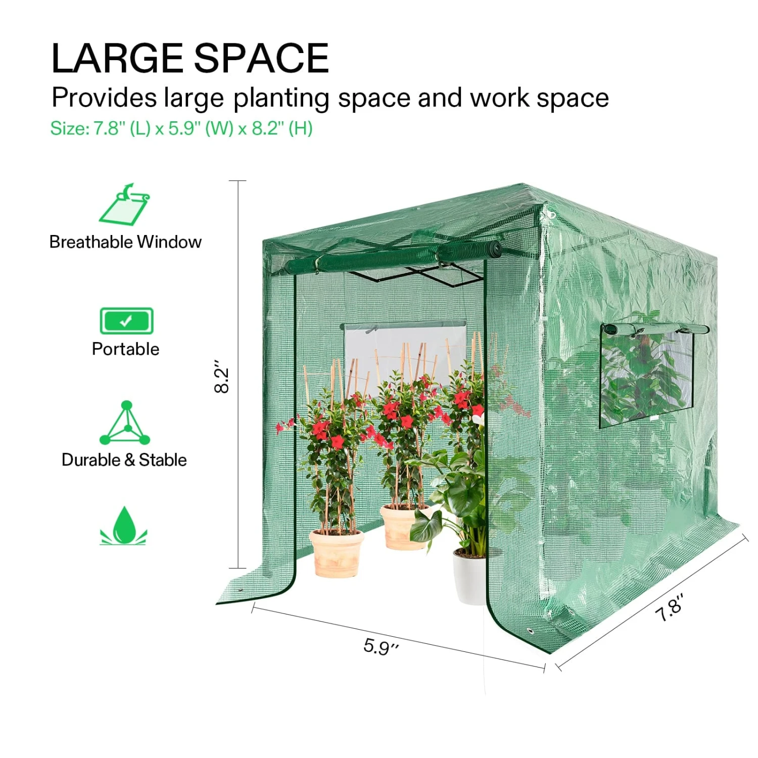 VIVOSUN 8’x6′ Portable Walk-in Greenhouse with PE Cover, Instant Pop-up and Walk-in Folding, Roll-Up Zipper Entry Doors and 2-Side Viewing Windows, Easy Setup for Plants OutdoorLarge Space: Unfolded, the product’s dimensions are 7.8′ (L) x 5.9′ (W) x 8.2′ (H); 46 square feet of planting space creates more than enough space for your plants to grow; At the same time, you can move freely and easily throughout this spacious green house, making planting a joyEasy Installation & Storage: The pop-up folding green house is easy to use right out of the box, and can be installed in seconds without any tools; We also provide an extra storage bag for convenient carrying and storage; It’s easy to store and transport as the seasons changeHigh-quality PE Cover: The green house’s PE cover is sealed with double lines to make the cover tougher and more durable; The 140g PE material both prevents damage to plants from harmful rays and inclement weather and brings good solar performance, easily extending plants’ growth period to make your garden thrive all year roundRoll-up Entrance & Windows: Two zippered roll-up doors can be fully opened, allowing easy access; 2 side windows make for good ventilation and temperature control, while making it easier to keep out birds and observe plants; The window mesh is made of strong, scratch-resistant 40g polyester silkSturdy & Durable Frame: Made of powder-coated heavy-duty steel frame, the VIVOSUN green house is extremely tough and durable enough to withstand most outdoor conditions; In addition, 4x ropes and 16x ground spikes help strengthen its stability and security