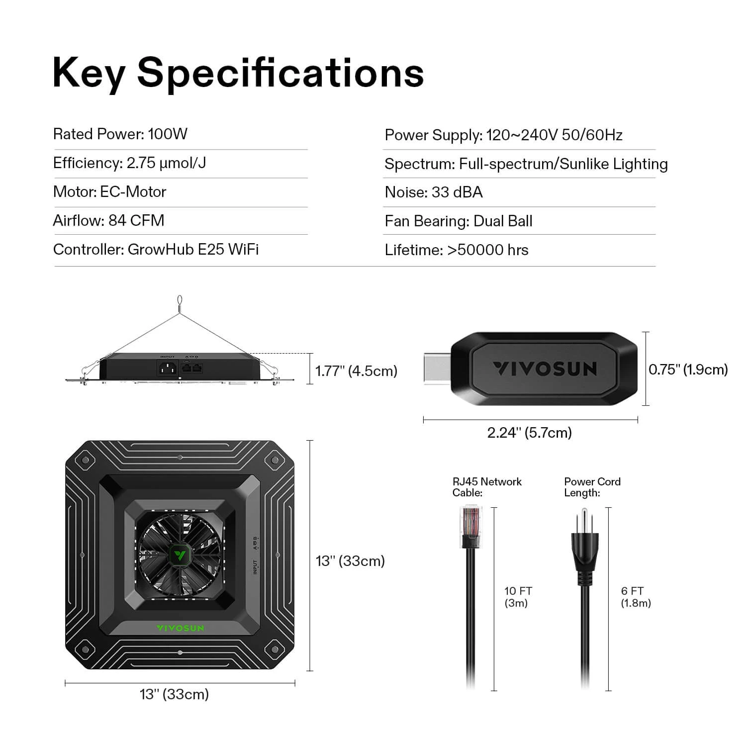It’s our compact, powerful version of our award winning AeroLight. This light features the same great programmability as the AeroLight along with the integrated fan that have made the AeroLight such an excellent way to grow. It has all these features and still produces 100W at a more compact size and competitive price.The AeroLight: The world’s first grow light with integrated circulatory fan to increase canopy airflow, balance temp and humidity, and Red Dot 2022 design award winner with dimmable driver, sunlike full-spectrum for all stages of growth that is programmable and adjustable.Low Cost & Full-spectrum Sunlike Lighting: Optimal light spectrum (380-780nm, 660nm, 3000K, 5000K) for better blooms and max PAR at various distances; Better spectrum improves germination rates, blooming times, plant production, and canopy penetration at 100W.The GrowHub E25: Connect with the VIVOSUN Smart Grow System, allowing you to monitor and control the AeroLight by the VIVOSUN App; connect a wide range of equipment and design Grow Recipes that will take your plant from seed to harvest automatically.VIVOSUN App: Manage multiple devices simultaneously, tracks and display relevant data to improve performance, chart climate changes, examine details or use preprogrammed Grow Recipes to program equipment, designed by professional growers.Automatic Operation: Automatically manage your grow space environment from anywhere in the world, automatic operation of intensity, airflow, and air circulation according to preset parameters, automatically adjust equipment in reaction to changes in environment.