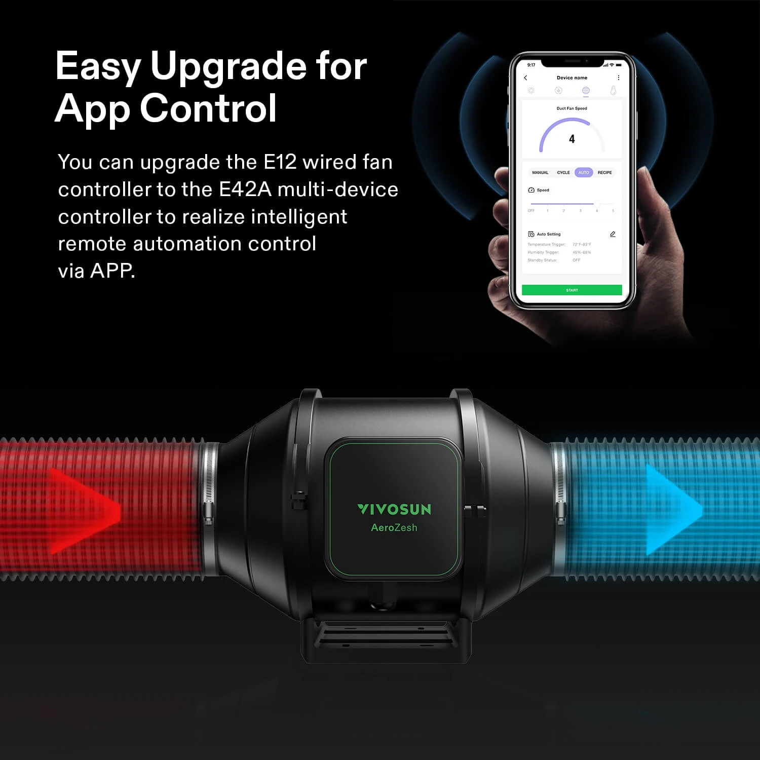 AeroZesh S6 Inline Duct Fan, Quiet 6” 405 CFM Ventilation Exhaust Fan w/EC Motor and GrowHub E12Efficient Ventilation: The AeroZesh S6 has powerful performance with airflow at 405 CFM to create optimal ventilation for your grow space; A PWM controlled EC fan with mixed-flow design that is fully adjustable and responsive to the environmentE12 Speed Controller: Ten fan speeds controlled by PWM can be selected by you; Turn off and then on again, backup memory can remember the speed set before the last shutdown; Three ON/OFF cycle mode can achieve the cycle of wind speed to save powerEntirely Programmable: You can upgrade the E12 fan controller to an E42A multi-device controller for more functionality; The GrowHub controller can be integrated with the App system for intelligent remote control of remote automation via the AppTemperature Control: Optimal device for temperature control with powerful airflow at a quiet 45dB operation to help balance humidity and temperature; With an included environmental probe, the AeroZesh monitors environmental changes and adjusts fan speed accordinglyOptimal for Indoor Growth: Ultra powerful and adjustable, the AeroZesh can be used in various sized rooms and is the center of your ventilation system; Equipped with a long power cord for easy installation, it can be hung anywhere in your tent easily