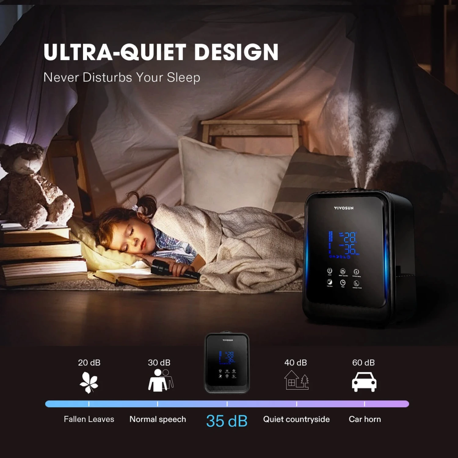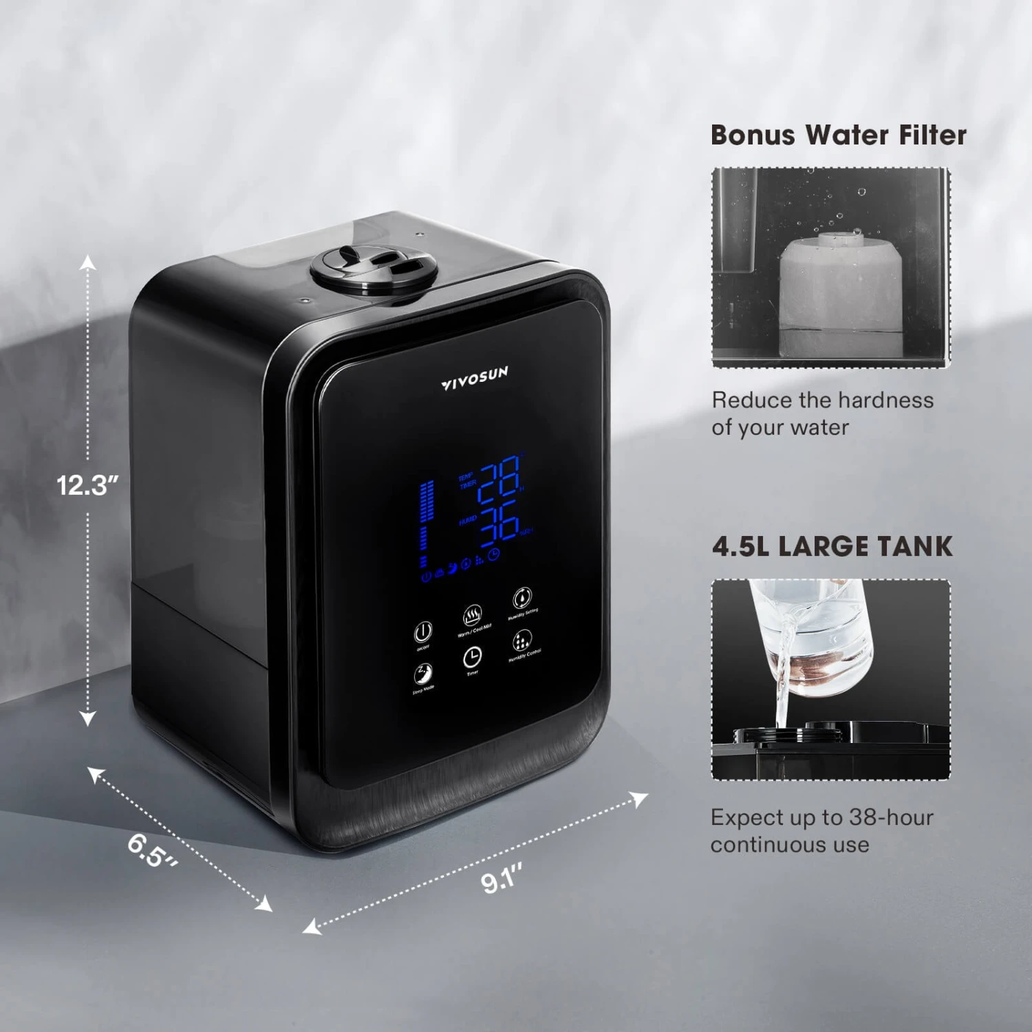 VIVOSUN Air Humidifier 4.5L 2-in-1 Cool & Warm Mist Humidifier, Indoor Ultrasonic Humidifier with Essential Oil Box & Remote Control for Bedrooms, Offices, Plants, Babies, Dryness, and Skincare4.5L Large Capacity + Warm & Cool Mist Options: Suffering from skin problems because of arid, overly dry air? Our solutionSmart Humidification System + Automatic Power-off: The device has a smart humidification system, which consists of an auto mode and constant humidity mode; You can adjust the humidity from 40% to 80% in 5% intervals; It senses moisture in the air and adjusts its output to maintain the set humidity level; The humidifier automatically powers off when facing water shortages, water tank removals, and overturning360° Nozzle & 3-Level Mist Volume & Two Control Methods: Comes with 3 adjustable (high/medium/low) mist levels; Double nozzles can rotate 360° for rapid humidification; Features two control methodsAir Ionization / Built-in Filter / Diffuser: Our ultrasonic humidifier is much more than your average, run-of-the-mill, regular humidifier—it’s also an essential oil diffuser, air ionizer, and built-in filter; The air ionizer and built-in filter work together to bring you cleaner, fresher air by increasing the number of negative oxygen ions in the air; The essential oil diffuser circulates fragrant oils into the mist, giving you the relaxing touch of wonderful aromasUltra-quiet + Sleep Mode + Timer: Our mini humidifier runs so quietly it’s almost silent (<35 dB)—you’ll be sure to get a good night of rest while it’s running; Set it on sleep mode to turn off all sounds; Comes equipped with a timer function with four options