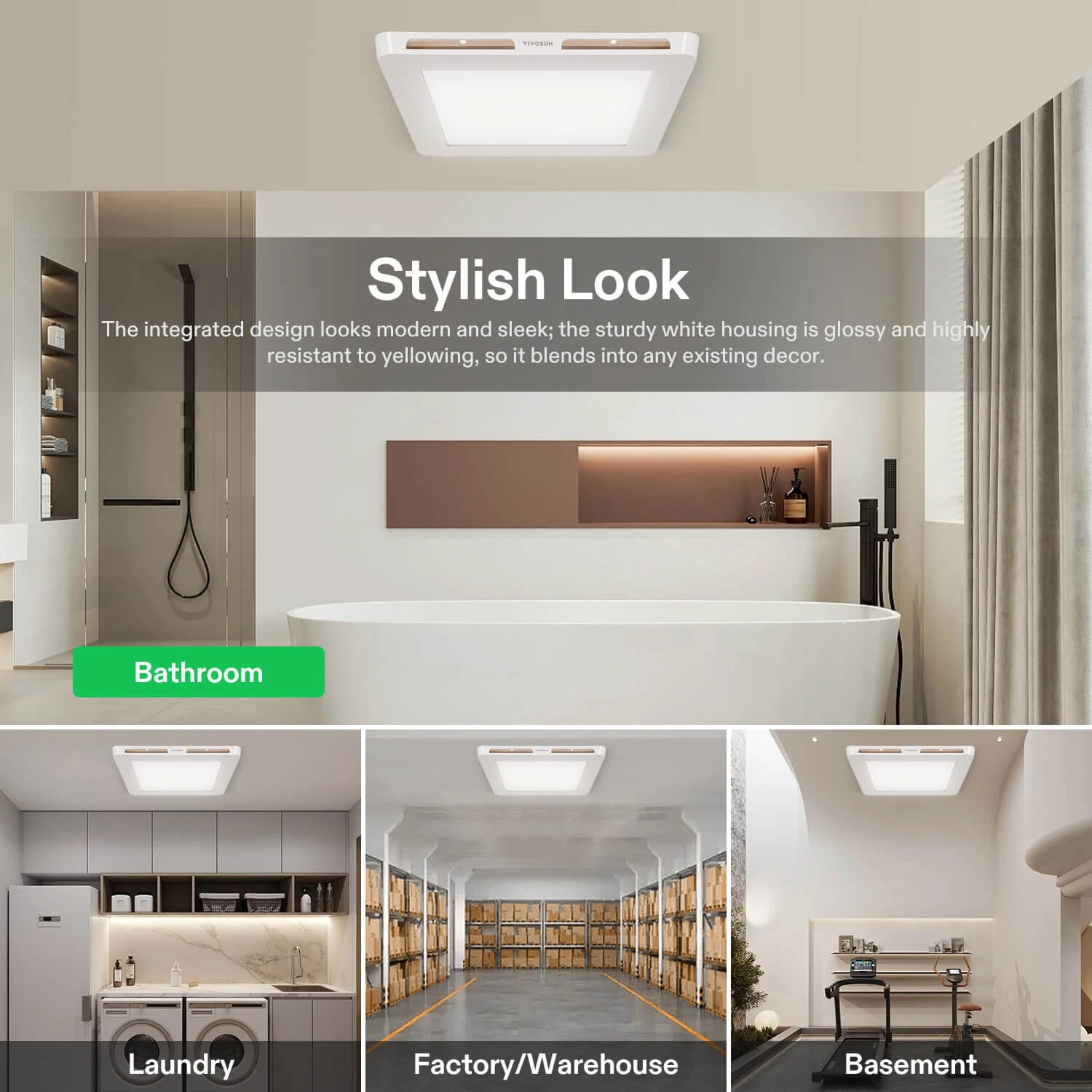 Ceiling Mount Vent Fan & Dimmable Light Combo, 1.0 Sones, 110 CFM, 4 Inch Duct Fan for Bath, Shower, Office, Restroom, 105 sq. ftIntegrated Design with Dimmable LED Light: This exhaust fan contains an integrated LED light, adding functionality and preventing injury in dark environments; The light has 3 color temperatures – 3000K warm white, 4000K cool white, and 6000K daylight – satisfying different needs; You can easily adjust the color with the flick of a switchEffective Ventilation: Features a permanently lubricated motor engineered for power and reliability; With robust 110 CFM airflow, it effectively removes unpleasant odors, excess moisture, and muggy heat from bathrooms up to 105 square feet; The improved air circulation enhances air quality while creating a fresher, more comfortable environmentWhisper Quiet: Built using advanced technology, this bathroom vent fan provides powerful air circulation with ultra-quiet operation; Rated at only 1.0 Sones, it removes humid air while maintaining a peaceful, relaxing environment; Enjoy your bath undisturbed, accompanied by tranquil silence or your favorite musicETL Certified & Durable: Built for quality and durability, this product is ETL certified for safe, long-lasting performance; The lightweight yet sturdy ABS and PP housing protects against rust and corrosion in humid bathroom environmentsEasy to Install: Installation is a breeze with the unified single-body design; Control fan and light functions independently or together based on your needs using the flexible wiring options; The stylish look blends into any existing decor, ideal for ceiling mounting in bathrooms, showers, offices, laundries, or restrooms (Mounting hole size: 10.43”×10.43”)