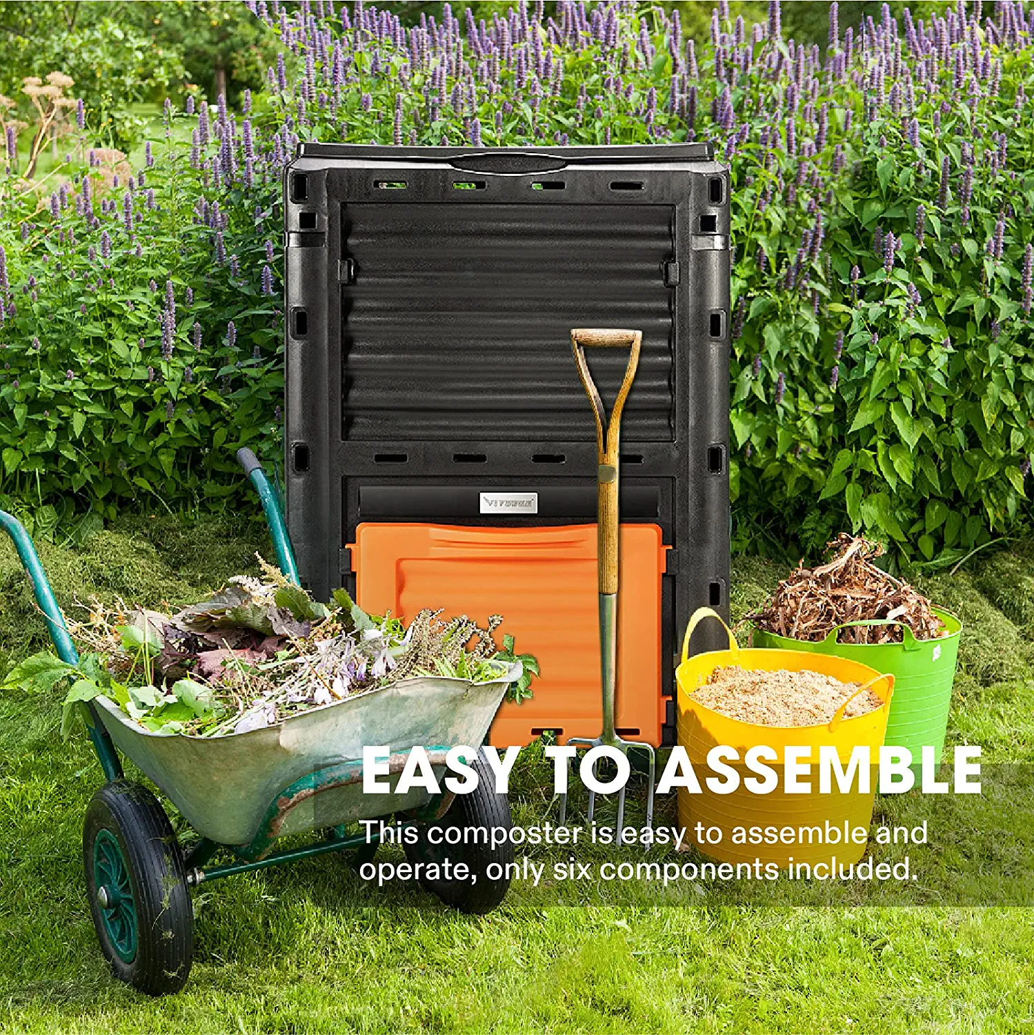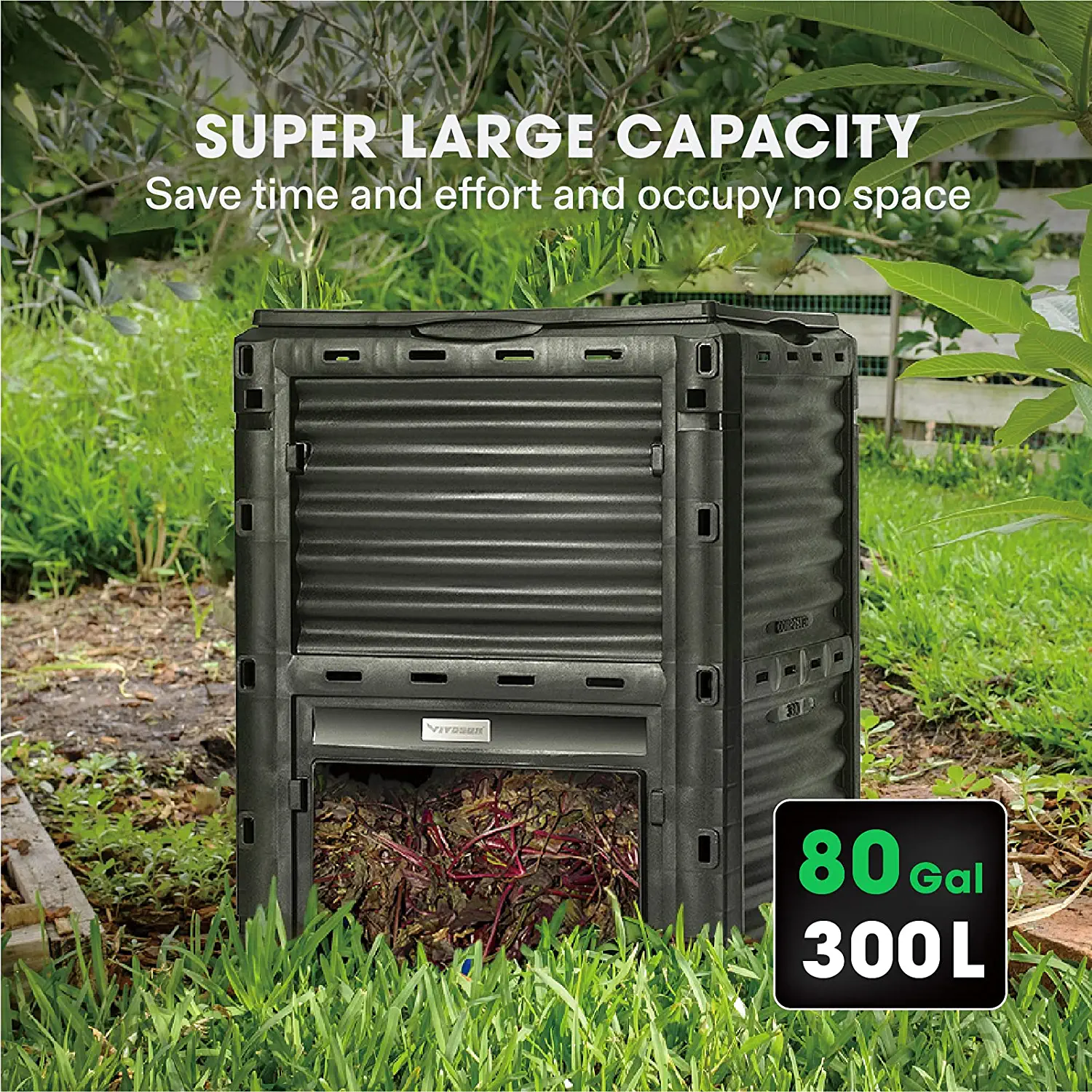 VIVOSUN Compost Bin 80Gallon (300L), Outdoor Composter W/ Large Capacity & Easy Assembling, Compost Barrel for Fast Creation of Fertile Soil80 Gallon Capacity: Unfolded SizeGreat Circulation System: Designed with four vents on each side to allow for air circulation; Made to enhance the contact area with oxygen for high fermentation efficiency6-8 Week Processing Time: The compost bin has a short processing time—in general, it only takes about 6-8 weeks in warm temperatures to produce fertilizer; The fertilizer can be used directly in the garden to enrich the soil; It reduces waste and works efficientlyEasy to Assemble: The assembly process is very easy; There are only six parts—effortlessly install them under the guidance of a manual; Follow the simple steps to use the tumbler composter to your heart’s contentA Win-Win Method: Reuse your daily food waste to achieve a win-win situation for you and the environment; Join us in composting outdoors and creating nutrient-rich soil for our vegetable and flower gardens