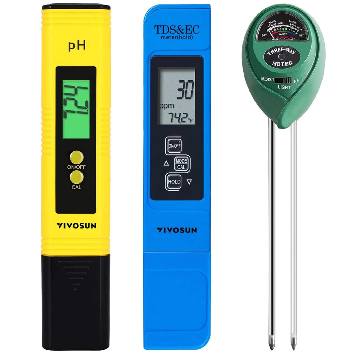 VIVOSUN Digital PH Meter, 3-in-1TDS EC and Temperature Meter, Plant Soil MoistureTester Combo for Home, Garden and HydroponicspH Meter: With an automatic temperature compensation function, the meter quickly adjusts to water temperature and provides pH readings on the LCD screen3-in-1 TDS Meter: Comes with automatic temperature compensation function; It can shut off automatically; Contains an agile titanium alloy electrode; With LCD screen and write with the hold function3-in-1 Soil Tester: Tests soil moisture, light, and pH—just press one button to switch modes; This tester can test soil moisture so you know when to water your soilEasy to Use: The pH meter is easy to use and read with a backlight; The TDS Meter can read and record easily with LCD screen; The soil tester is easy to carry and useVersatile Application: TDS and pH meter are ideal for homes, labs, aquariums, swimming pools, hydroponics, and drinking water; The 3-in-1 soil tester can test soil moisture, light, and pH
