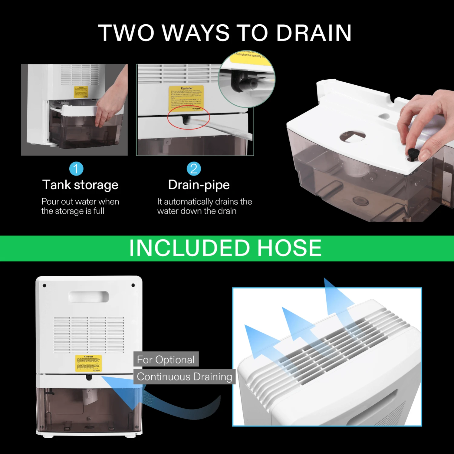 Electric Mini Dehumidifier with 2200ml TankCompact and Portable: The VIVOSUN dehumidifier is equipped with handles so that it can be conveniently moved from one place to another; Modern white fits into small homes, offices, tents, decor, or even caravanLarge Capacity: The 2200ml water tank can slide in and out easily, and could remove up to 700ml (23.67oz) of moisture per day and equipped with a drain hoseTouch Screen Control: Visualized ambient temperature and humidity with green LED indicator light; Operating temperature:25-30℃(77-86℉); Humidity: Over 85% relative humidity. The higher the humidity, the better the resultQuiet and Air Refresh: Built-in Thermos-Electric Cooling Technology (Peltier) operates without a compressor; Compared to the air compressor dehumidifier, this one requires a specific humidity environment which equipped with auto defrost and air refresh function and you will have much less to worry aboutAuto Shut-off and Timer Function: Automatically shut the unit off once the water reservoir is full; It can run non-stop for 24 hours or set a timer from 1 to 24 hours