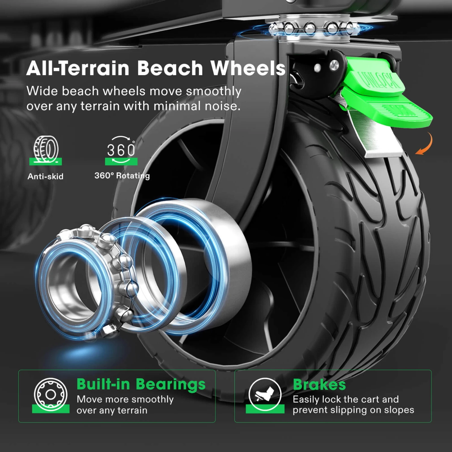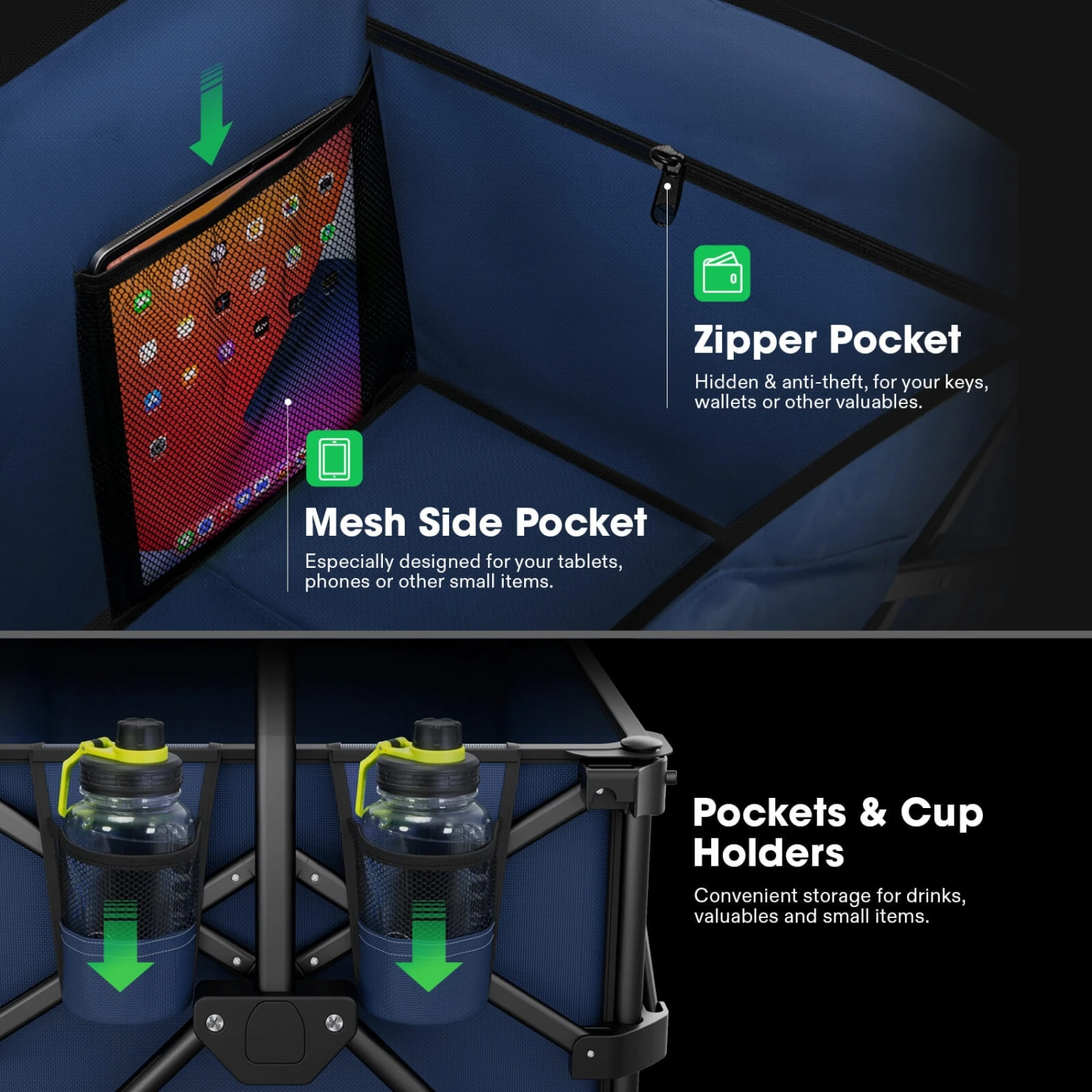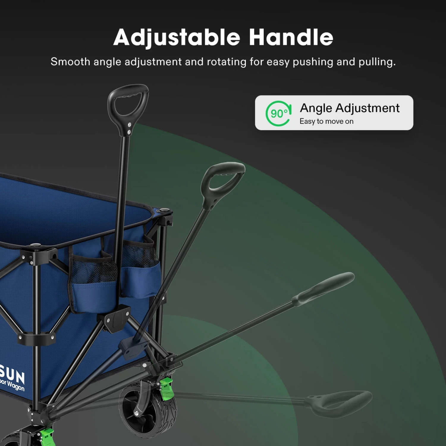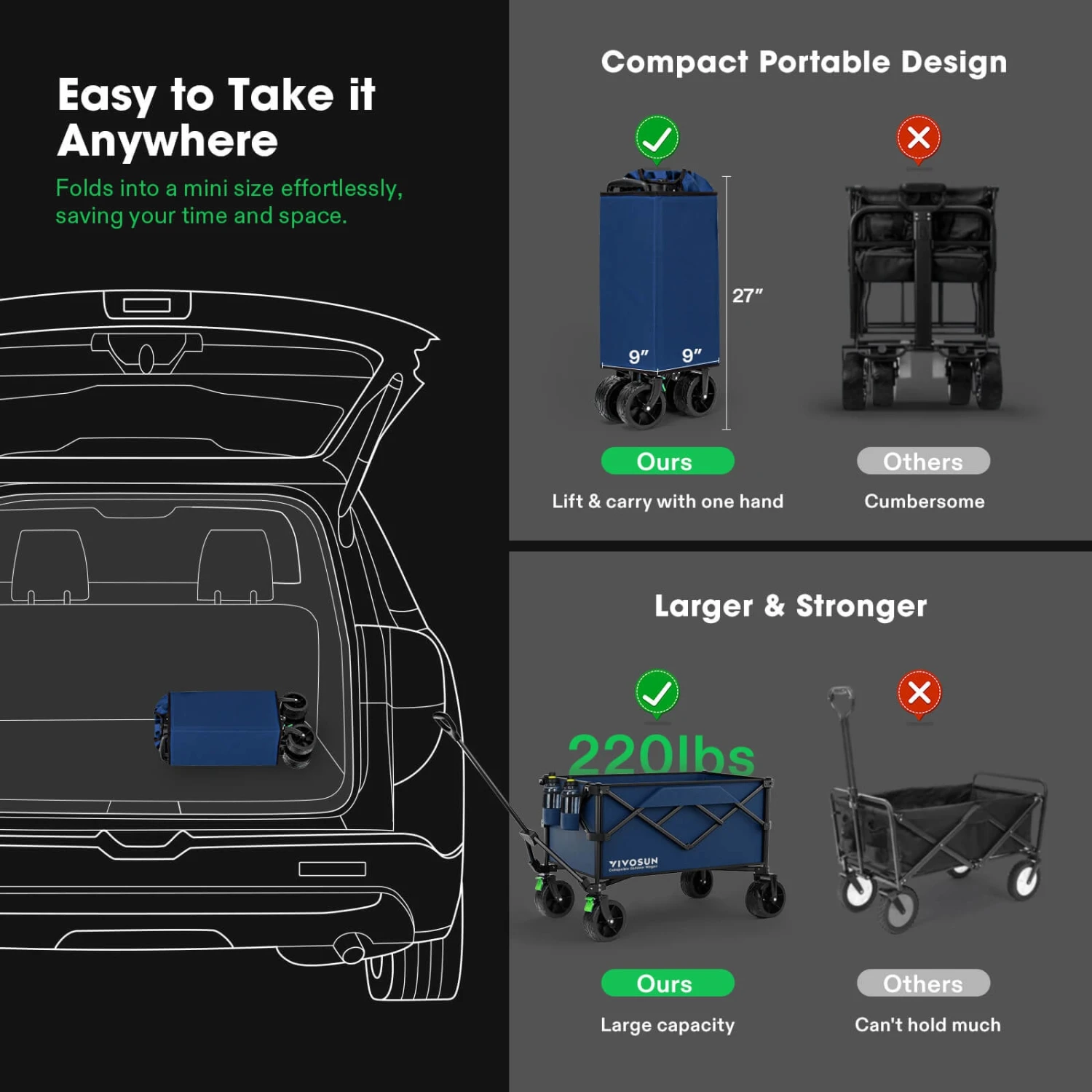 Folding Collapsible Wagon Utility Outdoor Camping Beach Cart with Universal Wide Wheels & Adjustable Handle, BlueLarge Capacity: This outdoor wagon has a large storage capacity and well-crafted parts that make it a powerful addition to your yard; Dimensions 35.4″ x 20.9″ x 40.2″; Constructed with a heavy-duty metal frame that can hold up to 220 lbs.; Includes two drink holders for your beveragesPremium Quality: The wagon is made of 600D Oxford fabric and PVC material that’s durable, waterproof, and won’t tear when you put something sharp in it; Easy to disassemble and cleanAdjustable Handle: Built with an adjustable handle that smoothly rotates to where you need it; The handle will not fall and its height locks with a joint, so no need to worry about an uncontrollable wagonRotating Front Wheels: Designed with 360°rotating front wheels that move smoothlyQuick to Fold and Store: The wagon’s compact design folds into a mini size; Easy to fold up with just one hand; Saves time and space and is convenient to carry all of your garden needsPackage Includes: 1x camping cart, 1x storage bag, 1x removable bottom support board