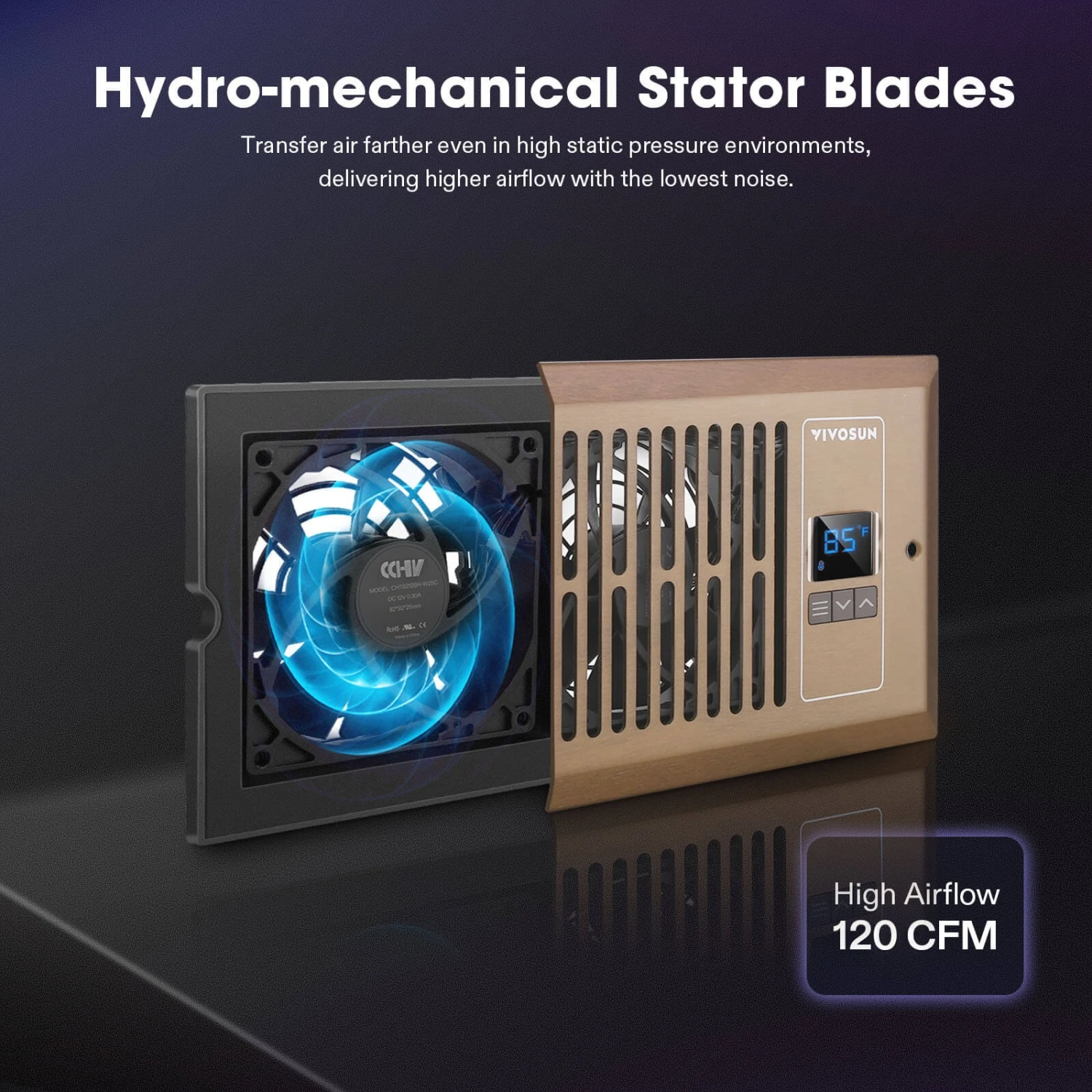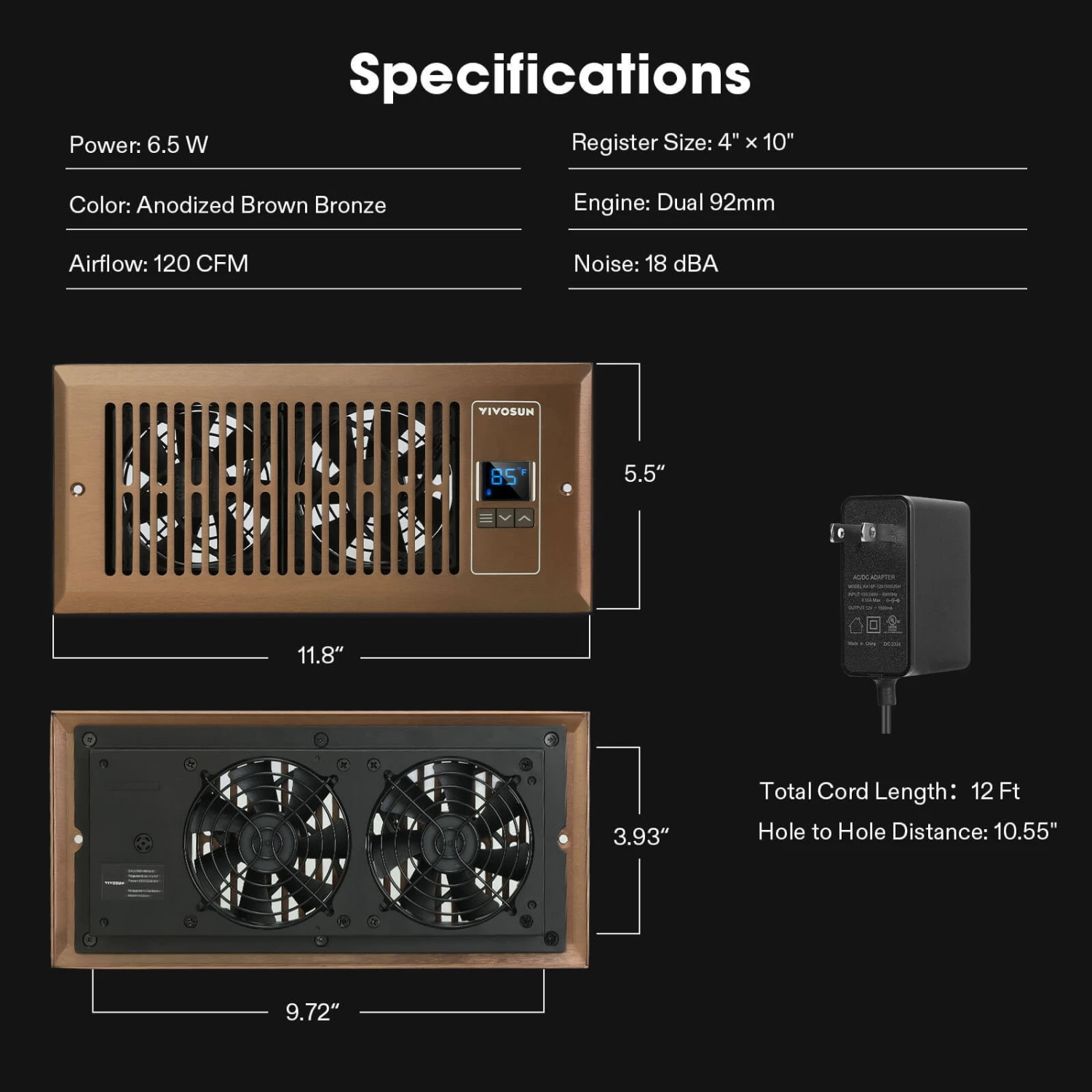 Smart Register Vent with Intelligent Thermostat ControlBalance Room Temperatures: Designed to complement HVAC systems, this fan efficiently boosts the airflow of your existing AC or heater, effectively redistributing warm and cold air for a more balanced temperature; Enjoy enhanced comfort while saving energy and cutting costsUltra-Quiet Stator-Blade PWM Fans: Features hydro-mechanical stator blades that transfer air farther even in high static pressure environments, ensuring powerful performance; The PWM-controlled motor with dual ball bearings ensures precise speed control, energy-efficiency, quiet operation and an extended lifespanIntelligent Programming: With a programmable LCD controller and high-precision temp probe sensor, this product automatically monitors temperature, and triggers fan to run at the cooling or heating temperatures you set, adjusting the fan speed accordingly; With 10 fan speeds, you can always get your desired airflowRugged Structure & Stylish Design: Features an premium aluminum frame with CNC-machined corners and a brown bronze finish; A sturdy and stylish design allows it to blend in with any decor; The thermoplastic housing protects the fans from clogging and ensures durabilityEasy to Install & Compact: Designed to fit perfectly into 4″×10″ register holes; It can be easily mounted on wall or floor registers (not recommended for ceiling mounting). Its compact design allows it to take up minimal space while delivering optimal performance