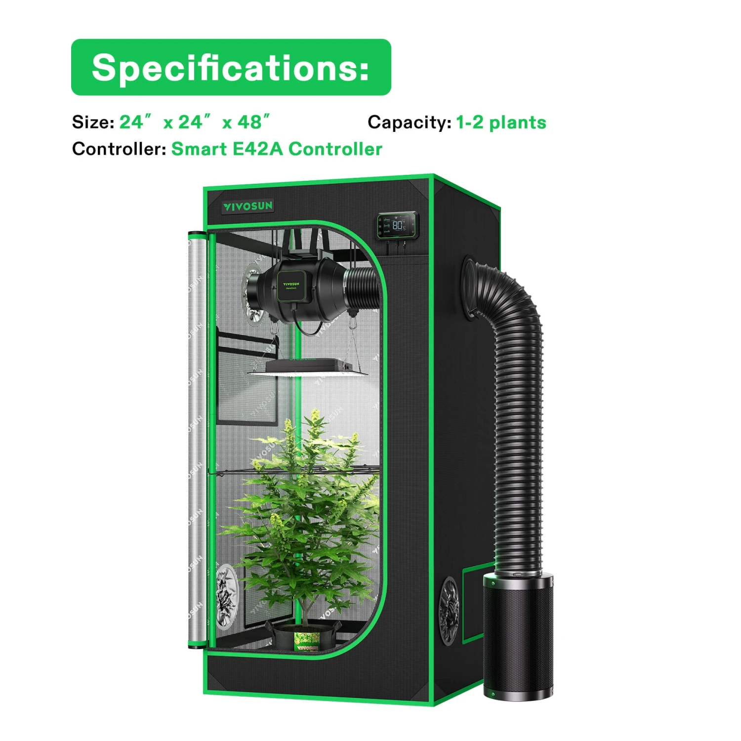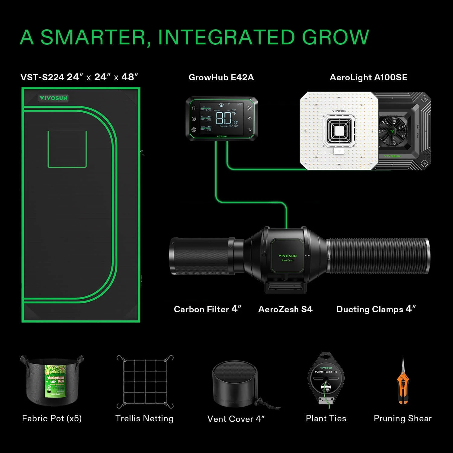 Kit includes: 3 x 3 ft. Grow Tent, AeroLight A200SE, AeroZesh S4 Inline Fan Combo, GrowHub E42A Controller, and an Accessory Pack.Grow Tent: Our highly reflective Mylar 3×3-foot grow tent is capable of housing 2 plants, it is the perfect size to start your growing journey.AeroLight SE: Our compact, powerful version of our award winning AeroLight. This light features the same great programmability as the AeroLight along with the integrated fan that have made the AeroLight such an excellent way to grow.AeroZesh: Our powerful and quiet 4-inch AeroZesh ventilation system provides fresh, cool air for your plants while filtering odors from the grow space.GrowHub: Our GrowHub Controller simplifies growing. You can remotely control devices from anywhere, all-in-one platform for controlling, monitoring, designed for growers of all experience levels.Accessories: Our accessory pack has everything you need for growing, including enough fabric pots, trellis netting that fits grow tent size, 328-foot plant ties, and VIVOSUN trimming shears.