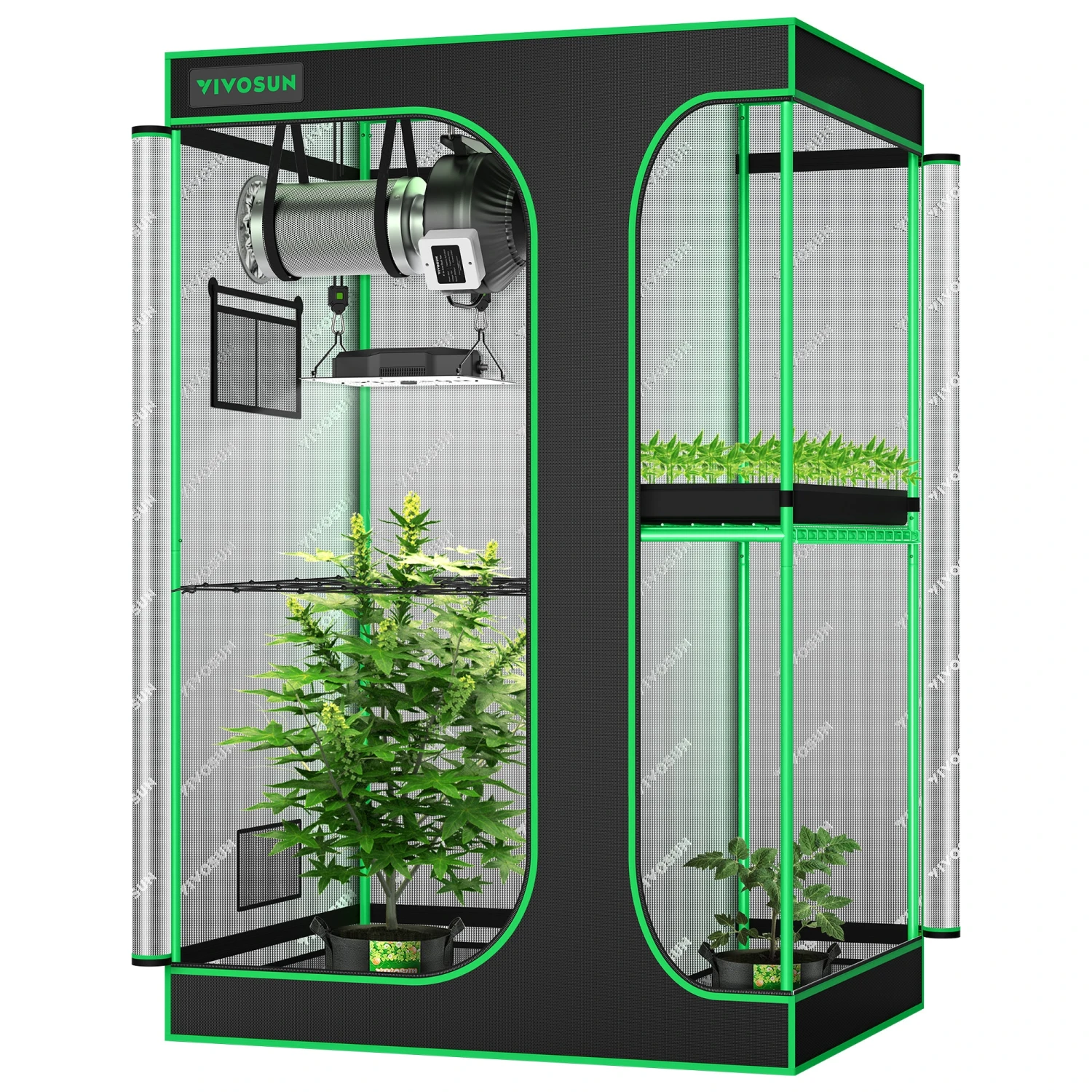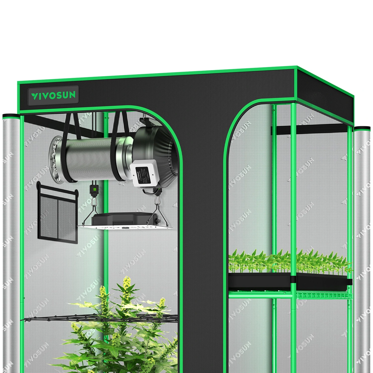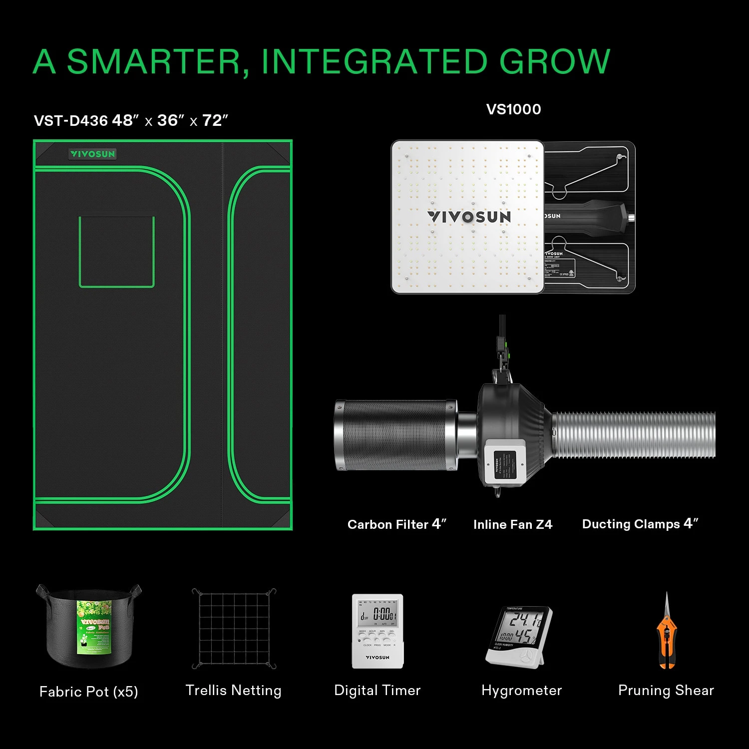 Kit Includes: 1x 2-in-1 VIVOSUN 4×3 Grow Tent, 1x VS1000 LED Grow Light, 1x Protection Eyeglasses, 1x 4-Inch 203 CFM Inline Duct Fan, 1x 4-Inch Carbon Filter, 1x 4-Inch 8 ft Ducting, 2x 4-Inch Clamps, 1x VIVOSUN Elastic Trellis Netting With Hooks 3x3ft, 1x 5-Gallon Grow Bags (5-Pack), 1x Temperature Humidity Monitor, 1x Straight Stainless Orange Gardening Scissors, 1x 7-Day Digital TimerOverview: Our Complete Grow Tent Kit includes everything you need to start growing! It is easy to set up and is the most integrated kit for new growers.Grow Tent: Our highly reflective Mylar 4×3-foot grow tent is capable of housing 1-2 plants and grow some baby plants at the same time, it is the perfect size to start your growing journey.Grow Light: Our energy efficient VS1000 LED Grow Light is ideal for the 4×3 grow tent and is capable of providing optimized spectral ranges for all stages of a plant’s life cycle. While two of our T5 light fixtures are perfect for the baby plants on the side.Ventilation: Our powerful and quiet 4-inch ventilation system provides fresh, cool air for your plants while filtering odors from the grow space.Warranty: Our five-year warranty on the grow light and one-year warranty on the rest of the kit show great confidence in our products.