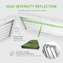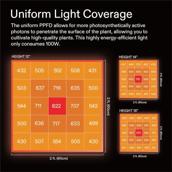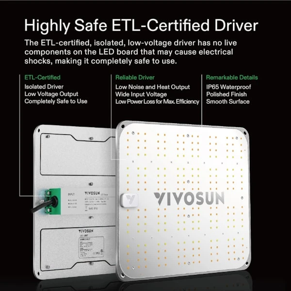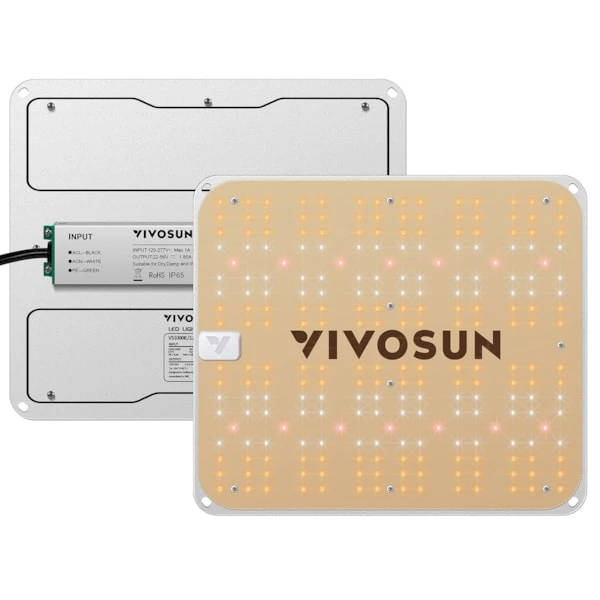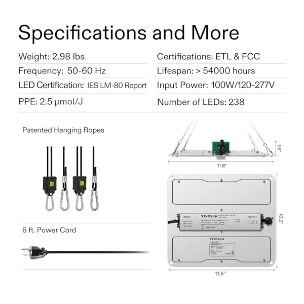 VS1000E LED Grow LightPackage Includes: 1 x LED Grow Light KitHigh Efficiency: The improved VIVOSUN 100W LED Grow Light comes with 238 Samsung diodes; With an output of 2.5 umol/J and only 100W of energy consumption, the grow light is highly efficient and delivers more uniform, optimized lightETL-Certified Safe Driver: The driver is an ETL-certified low voltage driver, it’s completely safe to use; The driver is isolated, which means it is not directly on the LED board and thus significantly reduces the risk of electric shockSunlike Spectrum Lighting: The grow light has an optimal full-spectrum coverage that includes 3000K, 5000K, 660nm, 750nm light (i.e., white, warm white, red, and far-red light); Give your plants what they need in every growth stageMore Light, Less Heat: Our led plant light allows more energy to be converted into light rather than heat; The aluminum heat sink enables the light to cool down faster and run quietlyBonus Hangers & Well-made Details: Comes with an extra set of hangers for easy hanging; IP65 waterproof level can tackle the typical moisture in the tent; Perfect for 2 x 2 ft. tent