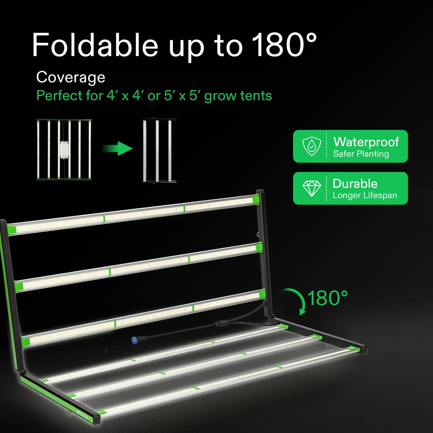 Package includes: 1x VSF6450 LED Light 1x 24-hour Plug-in Timer 1x 120V to 240V Plug Adaptor 1x Custom Suspension Kit 1x Manual.Full-Spectrum Sunlike Lighting: Designed with optimal light-spectrum coverage using 2142PCS Samsung 3030 (6500K) lights and 84PCS 660nm Osram 3030 lights in the white, warm white, red, and far-red light spectrums; The 660nm diodes improve photosynthesis and are most beneficial during blooming and flowering; Blue light promotes plants’ germination and when combined with the red lights leads to higher yields.Daisy-Chain-Ability: The daisy-chain ability allows connections of up to 160 lights in a series — simply control the main light with a VIVOSUN controller to dim or brighten all the lights in the series; We offer you a digital timer to control/preset the light, making it easy if you are not home; It can be used for indoor planting, grow tents (perfect for 4’ x 4’ or 5’ x 5’), hydroponics, gardens, and commercial cultivation in large rooms.Foldable Design & Detachable Ballast: The grow light can be folded up to 180° making it easy to install or store and thus keeping your room tidy; It comes with a detachable ballast and a 9.8ft. long power cord with 120V America NEMA 5-15P plug; Mounting the ballast outside the tent or away from the light can reduce ambient heat and extend your light’s service lifespan.Dimmable & Uniform Lighting: Comes equipped with a dimming knob with 6 levels of light intensity ranging from 0% (off), to 40%, 50%, 60%, 80%, and 100%; The light bar design has IP66 water prevention, benefits from heat dissipation, and enables uniform light density throughout the plant canopy at all stages of growth.High Efficiency & Stability: With Samsung 3030 & OSRAM 3030 and the Inventronics driver, this grow light achieves 40% higher PPFD than HID lamps and delivers high-efficiency (2.8μmol/J) LED light with low power consumption (645W) for real energy savings; Ideal for efficient and effective gardeners and specialists.